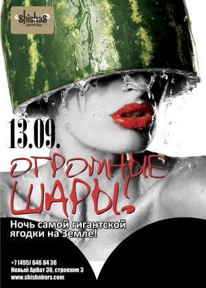 СУББОТА – 13 СЕНТЯБРЯ 2014 – ОГРОМНЫЕ ШАРЫ в Shishas Sferum Bar! Ночь самой гигантской ягодки на Земле! Дамы с третьим и четвертым размером, настала Ваша ночь! Сегодня Вы – царицы нашей вечеринки, королевы нашего INSTAGRAM! Упаковывайте Вашу красоту в кружева и глубокие декольте, и все внимание гарантированно будет приковано исключительно к Вам! Все большие арбузы – к Вашим ногам! ;) Самая гигантская ягодка заслуживает не меньшего внимания! Приятная сочная прохлада арбуза – самое лучшее лекарство наутро после ночи в Shishas Sferum Bar! Спасает от обезвоживания и реанимирует почки... :) Ей сегодня – хвала и честь! Объявляем ночь арбузов во всех их видах в Shishas Sferum Bar: четвертый размер – для глаз, танцы – для тела, сочные арбузы – для удовольствия! Отдельные маньяки могут прилично сэкономить: тащи свой арбуз в бар и бармен сделает тебе коктейль от заведения прямо в нем! • Принеси арбуз нашим барменам – с нас КОКТЕЙЛЬ В ПОДАРОК прямо в нем! Non-stop DJ set от резидентов: 18:00-06:00 *********************************************************************** Happy Hours: Отдыхаем до 6 утра! РЕЗЕРВ И ИНФО: +7 (495) 646 84 36 |