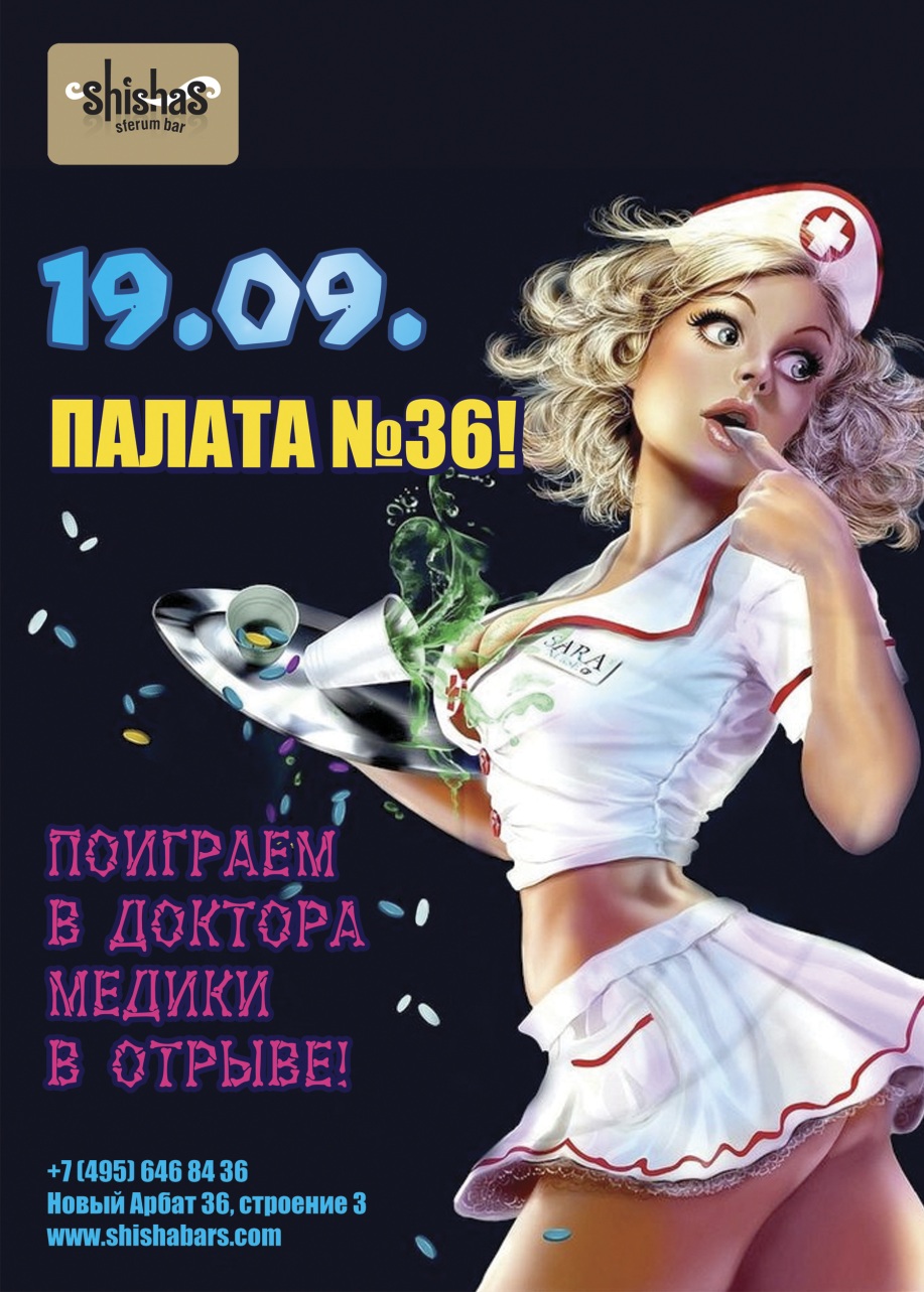 ПЯТНИЦА – 19 СЕНТЯБРЯ 2014 – ПАЛАТА №36 в Shishas Sferum Bar! ПОИГРАЕМ В ДОКТОРА? Медики в отрыве! Друзья, пили ли Вы когда-нибудь чистый медицинский спирт? Тоже нет? А говорят, это самый чистый, безвредный и беспохмельный алкоголь из всего, что принимают внутренне... Так это или нет – послушаем, как говорят, специалистов! А у нас сегодня приготовлено лекарство иного рода! Море рецептур, от старой доброй классики до экзотических новинок, самые прогрессивные и легко усваиваемые микстуры и живительные эликсиры – ищите эти средства у наших барменов в Shishas Sferum Bar, и они мигом вылечат Вас от уныния, хандры и безделья! Но это еще не все! Очаровательный персонал Shishas Sferum Bar – медсестры и медбратья – мигом проведут Вас в чувство, помахав перед носом своим большим... шприцем! Признайтесь, Вы же мечтали об этом, просматривая фильмы для взрослых? Настало время, и dreams come true – только в Shishas Sferum Bar Вас примут высококвалифицированные медики! Имеются противопоказания, требуется консультация шишинских специалистов! :) Приходи в костюме медсестры или медбрата – с нас КОКТЕЙЛЬ В ПОДАРОК! Non-stop DJ set от резидентов: 18:00-06:00 Happy Hours: • 12:00-16:00 – скидка 20% на ВСЕ БЕЗАЛКОГОЛЬНОЕ меню! Отдыхаем до 6 утра! |