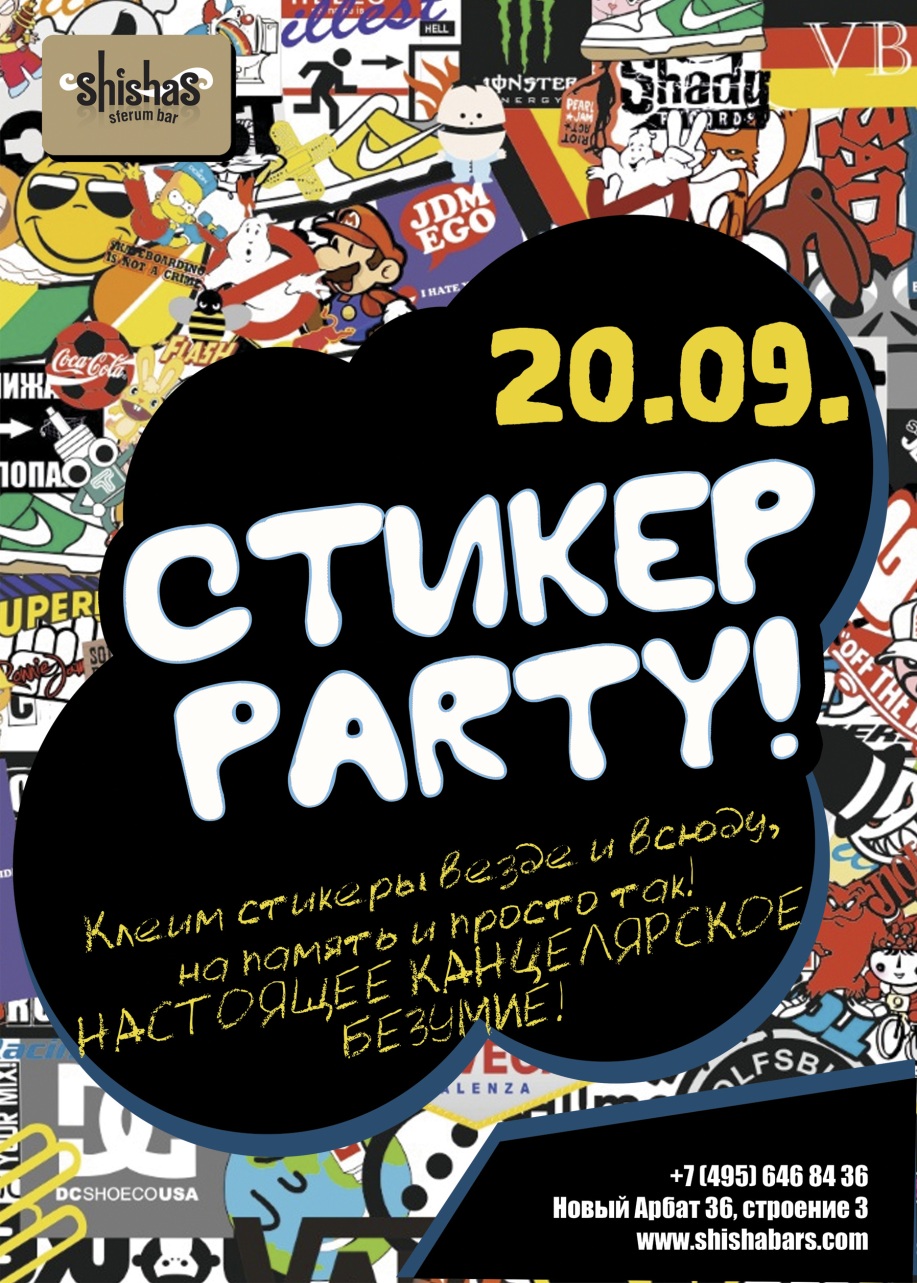 СУББОТА – 20 СЕНТЯБРЯ 2014 – СТИКЕР PARTY в Shishas Sferum Bar! Клеим стикеры везде и всюду, на память и просто так! НАСТОЯЩЕЕ КАНЦЕЛЯРСКОЕ БЕЗУМИЕ! Хорошая болезнь склероз: каждый день новости! Сегодня клеим не девчонок (хотя и девчонок, конечно, тоже), а разноцветные стикеры-напоминания – кошмар офисного рабства! Ты ведь давно натащил из офиса домой несколько пачек разноцветных стикеров, признайся? Смело клади их карман и иди в Shishas Sferum Bar – наконец-то им найдется применение! Каждый сочный цвет – это твое настроение, а что написать – пылкое признание в любви или затаенное желание, решать тебе: сбудется и то, и другое! Кроме того, пару пачек стикеров можно запросто обменять на бесплатный коктейль в баре! Ну что, скромные офисные служащие, настало Ваше время! Долой капроновые колготки в тридцатиградусную жару, застегнутые наглухо воротники рубашек и блузок и картонные офисные пиджаки! Переговоры, документы и даже секс на офисном ксероксе – все это подождет до понедельника! А сегодня в Shishas Sferum Bar – настоящее канцелярское безумие, СТИКЕР PARTY!!! Принеси пару пачек стикеров (можно стащить из офиса :)) – с нас КОКТЕЙЛЬ В ПОДАРОК! Non-stop DJ set от резидентов: 18:00-06:00 Happy Hours: Отдыхаем до 6 утра! |