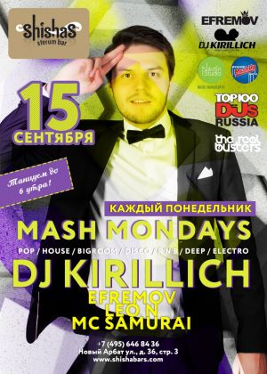 ПОНЕДЕЛЬНИК – 15 СЕНТЯБРЯ 2014 – Mash Mondays в Shishas Sferum Bar! Теперь мы отдыхаем до 6 утра и по ПОНЕДЕЛЬНИКАМ! СТОЛЫ БЕЗ ДЕПОЗИТОВ! SPECIAL GUEST: DJ KIRILLICH! Все вокруг только и говорят, что о клубном сезоне. А мы не говорим, мы его делаем и запускаем новый проект ПО ПОНЕДЕЛЬНИКАМ – Mash Mondays в Shishas Sferum Bar! Только лучший саунд, самые отборные треки, горячие GO-GO, заводные MC, крутые МЭШАП диджеи и, конечно, наши фирменные СУПЕР-ПУПЕР АКЦИИ на бар, кухню и кальяны!!! 15 СЕНТЯБРЯ 2014! SPECIAL GUEST: DJ KIRILLICH! DJ KIRILLICH – успешный Московский ди джей и саунд продюсер. Резидент популярного музыкального клубного бренда THE REAL BUSTERS. Кириллыч – невероятно техничный ди джей. Обладает техникой Scratch, Speedmix и многими другими «фишками». Один из самых востребованных DJ страны, как среди молодежи, так и среди более старшей публики!