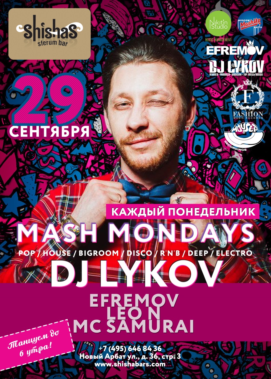 ПОНЕДЕЛЬНИК – 29 СЕНТЯБРЯ 2014 – Mash Mondays в Shishas Sferum Bar! Теперь мы отдыхаем до 6 утра и по ПОНЕДЕЛЬНИКАМ! СТОЛЫ БЕЗ ДЕПОЗИТОВ! SPECIAL GUEST: DJ LYKOV! Все вокруг только и говорят, что о клубном сезоне. А мы не говорим, мы его делаем и запускаем новый проект ПО ПОНЕДЕЛЬНИКАМ – Mash Mondays в Shishas Sferum Bar! Только лучший саунд, самые отборные треки, горячие GO-GO, заводные MC, крутые МЭШАП диджеи и, конечно, наши фирменные СУПЕР-ПУПЕР АКЦИИ на бар, кухню и кальяны!!! 29 СЕНТЯБРЯ 2014! SPECIAL GUEST: DJ LYKOV! DJ LYKOV – креативный, стильный и яркий ди-джей России отлично сочетает эффектный внешний вид и музыку, создавая атмосферу незабываемого наслаждения и вечного заряда бодрости. Основатель и руководитель Промо-Лейбла MOUSE-P. Резидент Российско-европейского лейбла FASHION MUSIC RECORDS. Входит в 100 лучших DJ's России! ПО ПОНЕДЕЛЬНИКАМ с 23:00 и до 6 утра отдыхаем и танцуем под ритмы: POP, HOUSE, BIGROOM, DISCO, RnB, DEEP и ELECTRO! Mash Mondays – это серия ярких ПОНЕДЕЛЬНИКОВ для тех, кто не успел отдохнуть в выходные или начинает неделю с тусы! Mash Mondays – это отличная возможность попасть на сеты известных МЭШАП диджеев в будний день! Mash Mondays – это ночной град танцевальных стилей и диджей сеты топовых музыкантов и артистов! Mash Mondays – это веселые компании, вкусные кальяны и сумасшедшие акции на баре! HAPPY HOURS каждый ПОНЕДЕЛЬНИК: • ПИЦЦА меню – до 00:00 скидка 50% на ВСЕ ПИЦЦЫ! *********************************************************************** Отдыхаем до 6 утра! РЕЗЕРВ И ИНФО: +7 (495) 646 84 36 (доб. 2) |