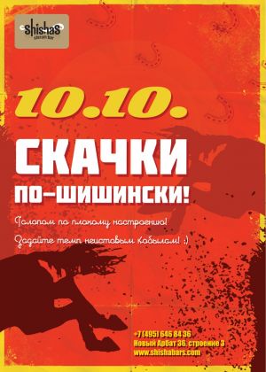ПЯТНИЦА – 10 ОКТЯБРЯ 2014 – Скачки по-шишински в Shishas Sferum Bar! Галопом по плохому настроению! Задайте темп неистовым кобылам! ;) Друзья, сегодня предлагаем Вам окунуться в изысканную светскую атмосферу скачек в Shishas Sferum Bar – присутствие мускулистых скакунов приветствуется, как и соревновательный дух под томные и горячие взгляды из-под шляп и вуалей под брызги шампанского. Очаровательные всадницы уже готовы оседлать сговорчивых и горячих мустангов и устроить невероятные скачки! А мы готовы галопом проехаться прочь от плохого настроения! Отдыхаем всю ночь напролет, и не жалеем горячительного – завтра нам не надо в седло, и утомительная рабочая гонка тоже оставит нас ненадолго в покое... Сегодня засветиться, стать мегапопулярными и подняться до самых небес стало просто как никогда – просто приходите на скачки в Shishas Sferum Bar на Новом Арбате! Искристое шампанское, эффектные коктейли, изысканные блюда, страстные поклонники, и, конечно, ставки – мы рады представить для Вас все, чтобы Вы почувствовали себя светскими львами и львицами! Сегодня, друзья, будем же на коне! :) • Всем дамам в шляпках – коктейль в подарок! За красоту и шарм! Non-stop DJ set от резидентов: 18:00-06:00 Happy Hours: Отдыхаем до 6 утра! АДРЕС: Москва, м. Краснопресненская, Новый Арбат ул., д. 36, стр. 3 (Торговый центр Сфера) |