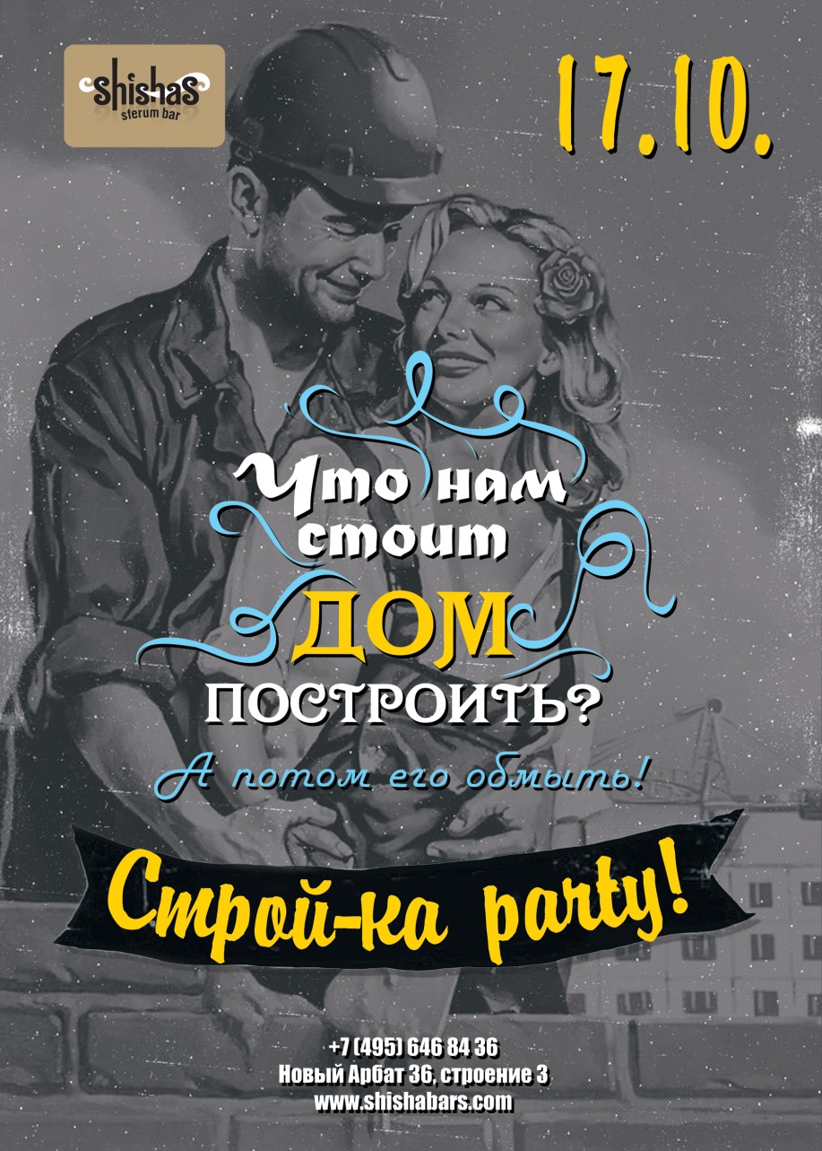 ПЯТНИЦА – 17 ОКТЯБРЯ 2014 – Строй-ка party в Shishas Sferum Bar! Что нам стоит дом построить? А потом его обмыть! Где, как не в Москве, устраивать «строительные» вечеринки? Только здесь количество гастарбайтеров на сотню жителей превышает все мыслимые и немыслимые прогнозы. В Shishas Sferum Bar тоже есть свои строители! Это не таджики и узбеки в засаленных робах, а существа совсем иного рода. Такие приходили к Вам в самых сладких и сокровенных снах, которые Вы никому не рассказывали. Очаровательные девушки в сексуальной униформе и, конечно, с инструментами в руках! В такой компании легче легкого построить не только дом, но и заложить фундамент отличного настроения на всю осень! Итак, сегодня настраиваемся на правильную физическую нагрузку – будем класть кирпичи, возводить леса и пилить доски вместе с нашими очаровательными красотками! А после того, как у нас получится что-то толковое, все вместе поднимем бокалы за созидающий строительный труд! Вы уже обзавелись строительными касками? • Принеси строительную каску – получи коктейль в подарок, железобетонно! :) Non-stop DJ set от резидентов: 18:00-06:00 День Рождения? Дарим скидку 20% на ВЕСЬ счет! :) Отметь День Рождение в Shishas Sferum Bar: получи скидку 20% на весь счет! Happy Hours: Отдыхаем до 6 утра! РЕЗЕРВ И ИНФО: +7 (495) 646 84 36 АДРЕС: Москва, м. Краснопресненская, Новый Арбат ул., д. 36, стр. 3 (Торговый центр Сфера) https://shusha.ru |