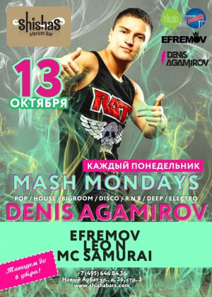 ПОНЕДЕЛЬНИК – 13 ОКТЯБРЯ 2014 – Mash Mondays в Shishas Sferum Bar! Отдыхаем до 6 утра и по ПОНЕДЕЛЬНИКАМ! СТОЛЫ БЕЗ ДЕПОЗИТОВ! SPECIAL GUEST: DJ DENIS AGAMIROV! Все вокруг только и говорят, что о клубном сезоне. А мы не говорим, мы его делаем и запускаем новый проект ПО ПОНЕДЕЛЬНИКАМ – Mash Mondays в Shishas Sferum Bar! Только лучший саунд, самые отборные треки, горячие GO-GO, заводные MC, крутые МЭШАП диджеи и, конечно, наши фирменные СУПЕР-ПУПЕР АКЦИИ на бар, кухню и кальяны!!! 13 ОКТЯБРЯ 2014! SPECIAL GUEST: DJ DENIS AGAMIROV!