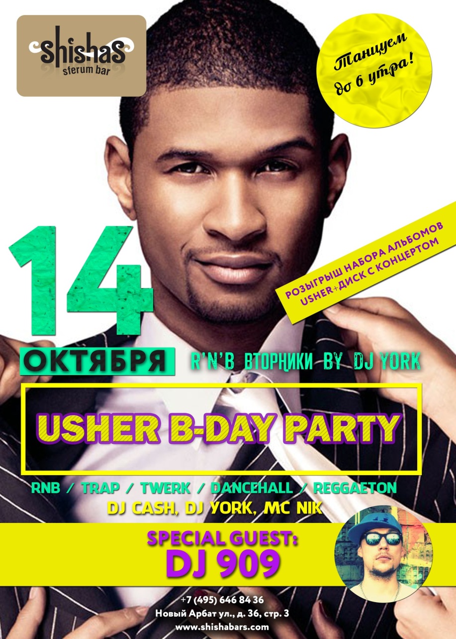 ВТОРНИК: Usher B-Day party в Shishas Sferum Bar! ЛЕГЕНДАРНЫЕ R’N’B ВТОРНИКИ by DJ YORK в Shishas Sferum Bar! SPECIAL GUESTS: DJ 909