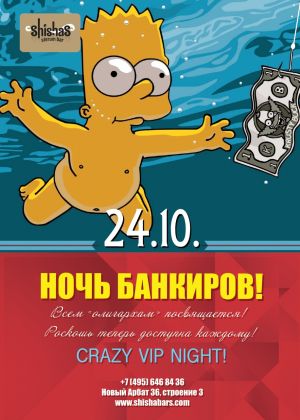 ПЯТНИЦА – 24 ОКТЯБРЯ 2014 – НОЧЬ БАНКИРОВ в Shishas Sferum Bar! Всем «Олигархам» посвящается! Неповторимая CRAZY VIP NIGHT! Роскошь, доступная каждому! Как известно, Shishas Sferum Bar на Новом Арбате – одно из самых стильных и модных мест Москвы, и наши Гости как нельзя лучше его украшают! Стильные мужчины в элегантных костюмах – на вес золота, и сегодня такие у нас водятся в избытке. Чувство вкуса – великий дар, которым нельзя не пользоваться, а предложения дизайнеров настолько обширны, что трудно сделать выбор. Надевайте лучшее и выходите в свет – подчеркните свою мужественность и сексуальность строгим и стильным черным цветом. Кстати, сегодня для Вас – самая сексуальная и волнующая программа, исключительно в самых откровенных и стильных костюмах... Посвятим вечер непреходящей элегантности и устроим вечеринку по всем правилам светского мероприятия. Сегодня, друзья, мы ждем Вас в стильных нарядах! CRAZY VIP NIGHT – роскошь, доступная каждому! Тех, кто явится к нам во фраке, визитке и смокинге, ждет эксклюзивный подарок от барменов!