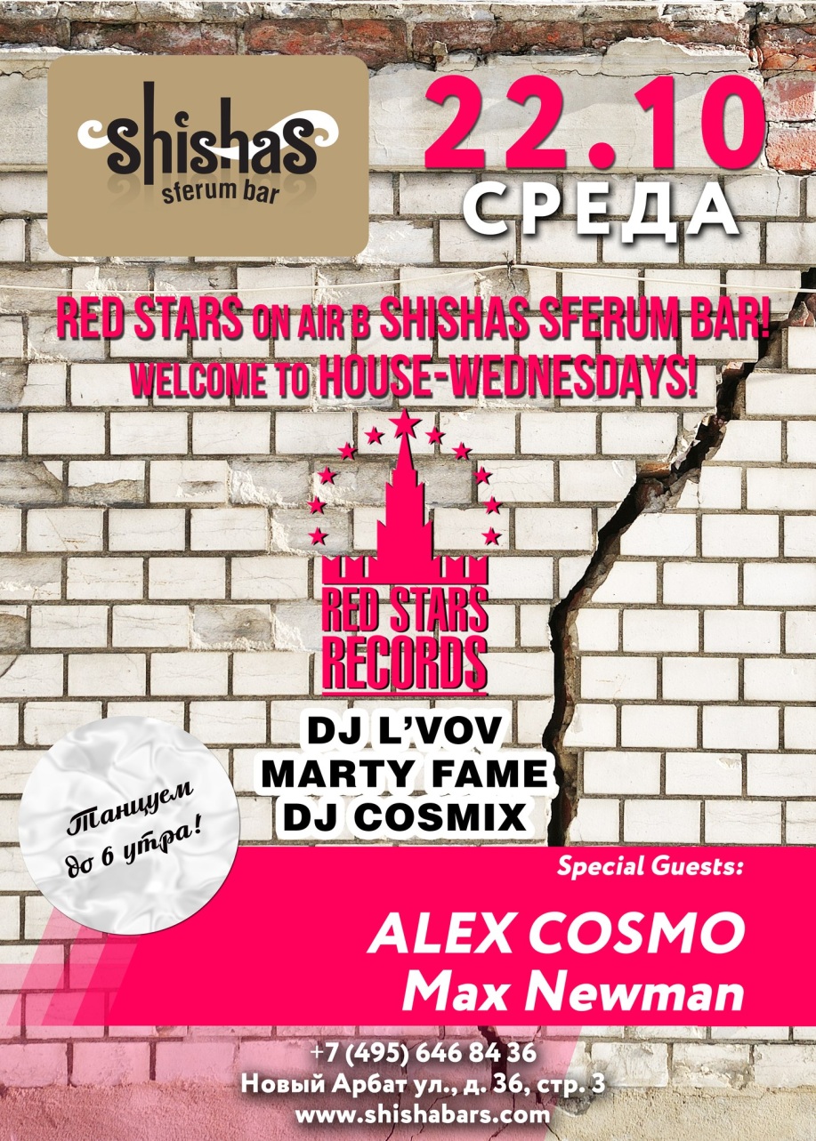 Red Stars On Air в Shishas Sferum Bar! Welcome to HOUSE-WEDNESDAYS! Открытие вечеринок самого авторитетного российского мультиформатного рекорд-лейбла России! СТОЛЫ - БЕЗ ДЕПОЗИТА!!! :) Shishas Sferum Bar и RED STARS RECORDS открывают HOUSE вечеринки по СРЕДАМ! Устали от банальной попсы, мэшапа и диско? Теперь у нас по СРЕДАМ с 23 часов только ХАУС! Welcome to HOUSE-WEDNESDAYS – Red Stars On Air в Shishas Sferum Bar! На сегодняшний день RED STARS RECORDS – пожалуй, самый продуктивный и авторитетный мультиформатный проект на территории бывшего СССР. К лету 2014 года его каталог насчитывает 130 официальных мировых релизов и 120 неофициальных, а реестр вмещает в себя 134 саунд продюсера и вокалиста из России, Украины, Беларуси, Казахстана, Англии, Германии и США. В июне 2014 RED STARS RECORDS поставили абсолютный рекорд среди отечественных производителей – 30 официальных релизов за 30 дней! Лейбл не ограничивает себя стилистически и выпускает все актуальные течения house музыки. Отличительной чертой всех релизов стало стильное и качественное звучание, без излишнего упора на западные ориентиры и возврата к трендам давно минувших лет! Стартуем – каждую СРЕДУ с 23:00 и до 6 утра! HAPPY HOURS каждую СРЕДУ: