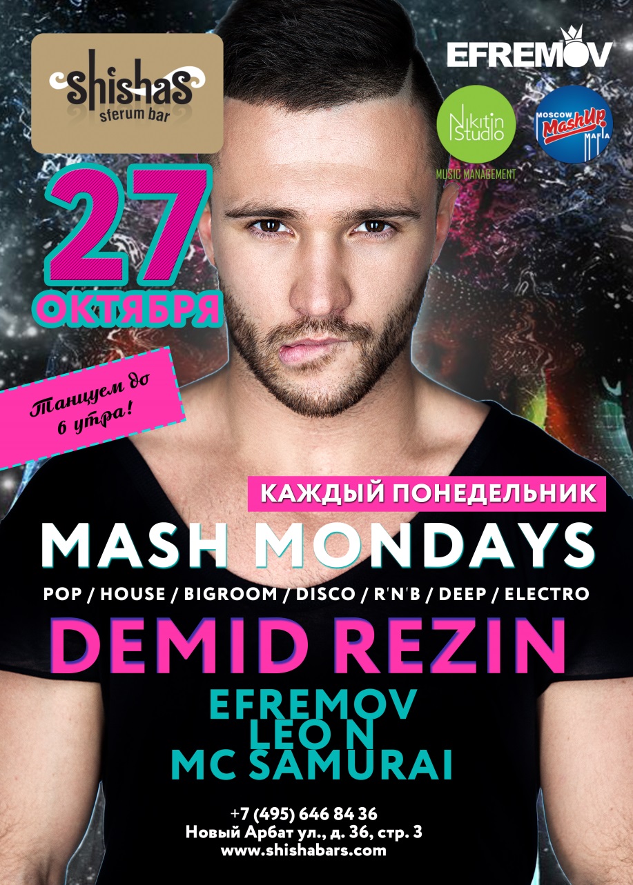 ПОНЕДЕЛЬНИК – 27 ОКТЯБРЯ 2014 – Mash Mondays в Shishas Sferum Bar! Отдыхаем до 6 утра и по ПОНЕДЕЛЬНИКАМ! СТОЛЫ БЕЗ ДЕПОЗИТОВ! SPECIAL GUEST: DEMID REZIN! Все вокруг только и говорят, что о клубном сезоне. А мы не говорим, мы его делаем и запускаем новый проект ПО ПОНЕДЕЛЬНИКАМ – Mash Mondays в Shishas Sferum Bar! Только лучший саунд, самые отборные треки, горячие GO-GO, заводные MC, крутые МЭШАП диджеи и, конечно, наши фирменные СУПЕР-ПУПЕР АКЦИИ на бар, кухню и кальяны!!! 27 ОКТЯБРЯ 2014! SPECIAL GUEST: DEMID REZIN! Demid Rezin – DJ, участник самого рейтингового шоу телеканала MTV «Каникулы в Мексике», ведущий «Каникулы в Мексике-2» , победитель «Супер Игры Каникулы в Мексике» на телеканале Пятница. Уже на протяжении нескольких лет он желанный гость на всех вечеринках Москвы и Санкт-Петербурга, постоянно гастролирует по России. Выступал во всех крупных городах от Калининграда и до Петропавловска-Камчатского. ПО ПОНЕДЕЛЬНИКАМ с 23:00 и до 6 утра отдыхаем и танцуем под ритмы: POP, HOUSE, BIGROOM, DISCO, RnB, DEEP и ELECTRO! Mash Mondays – это серия ярких ПОНЕДЕЛЬНИКОВ для тех, кто не успел отдохнуть в выходные или начинает неделю с тусы! Mash Mondays – это отличная возможность попасть на сеты известных МЭШАП диджеев в будний день! Mash Mondays – это ночной град танцевальных стилей и диджей сеты топовых музыкантов и артистов! Mash Mondays – это веселые компании, вкусные кальяны и сумасшедшие акции на баре! Shishas Bar – never sleeps!!! ;) Итак, теперь и в ПОНЕДЕЛЬНИК в Shishas Sferum Bar на Новом Арбате, Вам обеспечена отличная вечерина – Mash Mondays в Shishas Sferum Bar! HAPPY HOURS каждый ПОНЕДЕЛЬНИК: • ПИЦЦА меню – до 00:00 скидка 50% на ВСЕ ПИЦЦЫ! *********************************************************************** Отдыхаем до 6 утра! РЕЗЕРВ И ИНФО: +7 (495) 646 84 36 (доб. 2) |