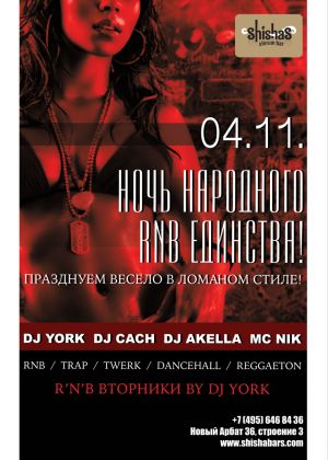 ВТОРНИК – 4 НОЯБРЯ 2014 – НОЧЬ НАРОДНОГО RnB ЕДИНСТВА в Shishas Sferum Bar! Легендарные R&B вторники by DJ YORK! Празднуем весело в ломаном стиле!
