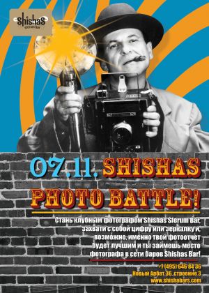 ПЯТНИЦА – 7 НОЯБРЯ 2014 – SHISHAS PHOTO BATTLE в Shishas Sferum Bar! Стань клубным фотографом Shishas Sferum Bar! Настало время почтить вниманием скромных тружеников объективов – тех людей, благодаря которым наши счастливые лица на вечеринках Shishas Sferum Bar на Новом Арбате навсегда вошли в летопись клубной жизни столицы! Щелчки фотозатворов, как и звуки вылетающих пробок от шампанского, ассоциируются с весельем, праздником, звездами и яркими моментами. Пусть таких моментов и поводов для праздника с каждым днем становится только больше! Итак, друзья, сегодня у нас – фотобаттл! Самые талантливые фотографы сделают сегодня подробные фотоотчеты: кто, с кем, что и как… Кто во сколько пришел, с кем, что пил, а главное, как был одет – а ты что подумал? :) Фоловь нас в Инстаграме, отмечайся и оставляй лайки и комменты – сегодня все самые крутые аватарки будут сделаны нашими фотографами. А может быть, среди них хочешь быть и ты? Смело пакуй свою зеркалку или цифру, и возможно, твой фотоотчет станет лучшим: тогда ты займешь почетное место фотографа нашего бара! Только будь аккуратен: пить будем много, и не…. потеряй свой фотоаппарат!:)