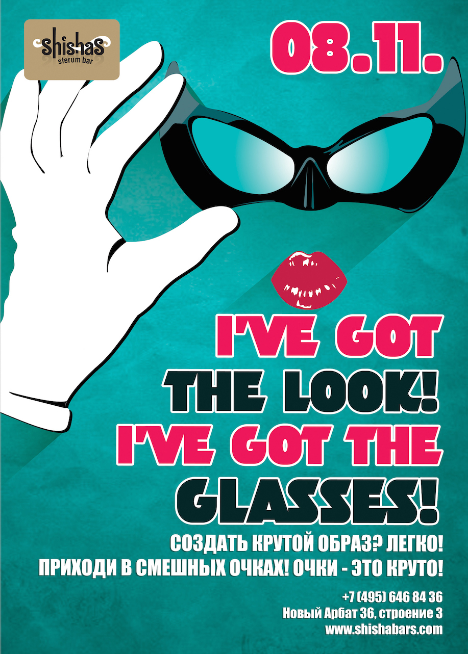 СУББОТА – 8 НОЯБРЯ 2014 – ВЕЧЕРИНКА В ОЧКАХ в Shishas Sferum Bar! I’ve got the look! I’ve got the glasses! Для того чтобы носить очки, мало быть умным – надо еще и плохо видеть, а ты не знал? Это в школе тебя дразнили очкариком с шариком в одном месте, что породило у тебя массу комплексов и проблемы с женским полом. Мы же считаем, что носить очки – это круто, стильно и полезно для здоровья! А фраза «набрать очки» – вообще наша любимая и очень позитивная! Но не всем так повезло с очками, но солнцезащитные очки наверняка есть у каждого – давайте заодно вспомним, вернее, помянем это промчавшееся лето, и принесем на вечеринку в Shishas Sferum Bar самые любимые очки! Квадратные и треугольные, в виде сердечек или крылышек, со стразами и с натуральными камнями – кто круче, тот и наберет сегодня очков по максимуму! Победит тот, у кого найдутся самые смешные очки. Не можешь найти смешные? Посмотри инстаграм Элтона Джона! :) По ходу вечеринки выбираем самые стильные и прикольные очки!