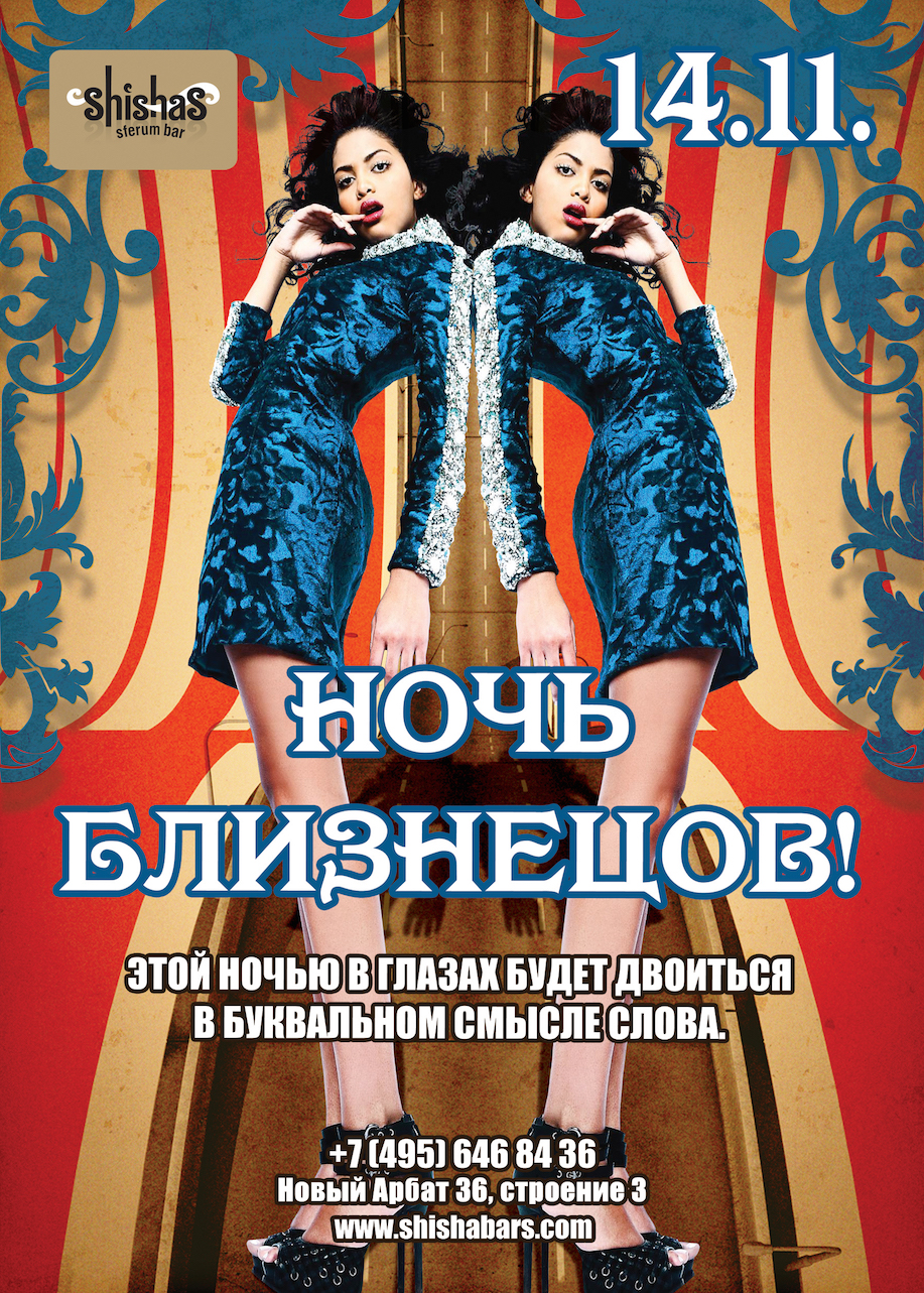 ПЯТНИЦА – 14 НОЯБРЯ 2014 – НОЧЬ БЛИЗНЕЦОВ в Shishas Sferum Bar! Этой ночью в глазах будет двоиться в буквальном смысле слова! SPECIAL GUESTS: DJ SEBASTIEN и DJ CLUBKILLA! Парни, признавайтесь: сколько раз в месяц Вы мечтаете оказаться в приватной обстановке с двумя девушками-близнецами? Сегодня Ваша мечта может стать реальностью – а сможете ли Вы увлечь своей персоной этих очаровательных близнецов, зависит только от Вас. Со зрением все в порядке – просто в Shishas Sferum Bar на Новом Арбате вечеринка в честь близнецов! Раньше оказаться на одной пати с девушкой, одетой точно так же как Вы, считалось дурным тоном и поводом немедленно ее покинуть. Сегодня это тренд – посмотрите, как умело используют double dress знаменитости и даже не бояться при этом фоткаться! Поэтому, если у Вас нет сестры или брата-близнецов, выходим из ситуации так: наряжаем подругу или друга в те же шмотки, что на Вас, и идем веселиться в Shishas Sferum Bar! Вариантов для развлечений будет масса: от конкурса «найти сто отличий» до конкурса двойников!