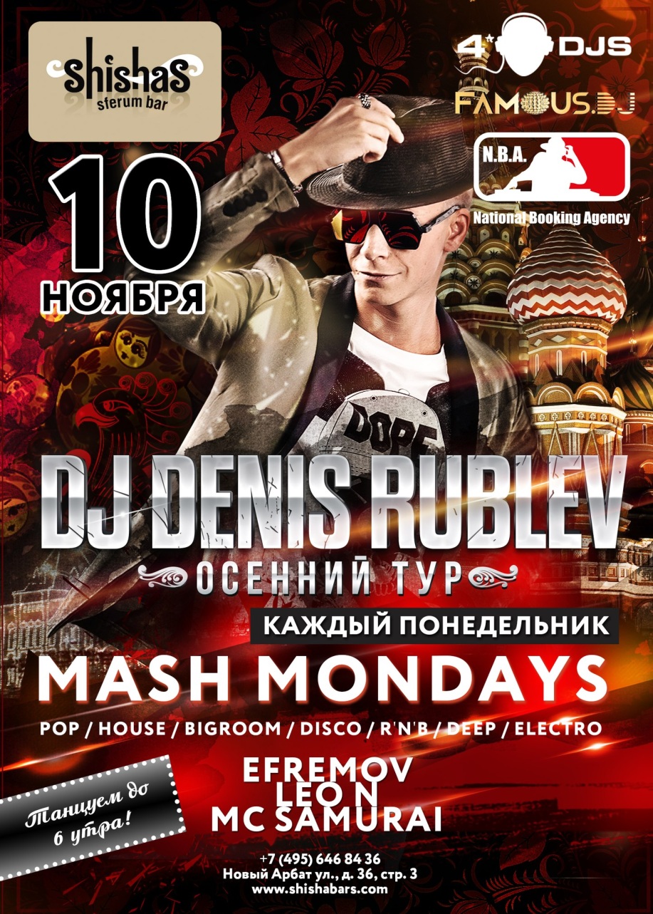 ПОНЕДЕЛЬНИК – 10 НОЯБРЯ 2014 – Mash Mondays в Shishas Sferum Bar! Отдыхаем до 6 утра и по ПОНЕДЕЛЬНИКАМ! СТОЛЫ БЕЗ ДЕПОЗИТОВ! SPECIAL GUEST: DJ DENIS RUBLEV! Все вокруг только и говорят, что о клубном сезоне. А мы не говорим, мы его делаем и запускаем новый проект ПО ПОНЕДЕЛЬНИКАМ – Mash Mondays в Shishas Sferum Bar! Только лучший саунд, самые отборные треки, горячие GO-GO, заводные MC, крутые МЭШАП диджеи и, конечно, наши фирменные СУПЕР-ПУПЕР АКЦИИ на бар, кухню и кальяны!!! 10 НОЯБРЯ 2014! SPECIAL GUEST: DJ DENIS RUBLEV! ПО ПОНЕДЕЛЬНИКАМ с 23:00 и до 6 утра отдыхаем и танцуем под ритмы: POP, HOUSE, BIGROOM, DISCO, RnB, DEEP и ELECTRO! Mash Mondays – это серия ярких ПОНЕДЕЛЬНИКОВ для тех, кто не успел отдохнуть в выходные или начинает неделю с тусы! Mash Mondays – это отличная возможность попасть на сеты известных МЭШАП диджеев в будний день! Mash Mondays – это ночной град танцевальных стилей и диджей сеты топовых музыкантов и артистов! Mash Mondays – это веселые компании, вкусные кальяны и сумасшедшие акции на баре! Shishas Bar – never sleeps!!! ;) Итак, теперь и в ПОНЕДЕЛЬНИК в Shishas Sferum Bar на Новом Арбате, Вам обеспечена отличная вечерина – Mash Mondays в Shishas Sferum Bar! HAPPY HOURS каждый ПОНЕДЕЛЬНИК: • ПИЦЦА меню – до 00:00 скидка 50% на ВСЕ ПИЦЦЫ! *********************************************************************** Отдыхаем до 6 утра! РЕЗЕРВ И ИНФО: +7 (495) 646 84 36 (доб. 2) |