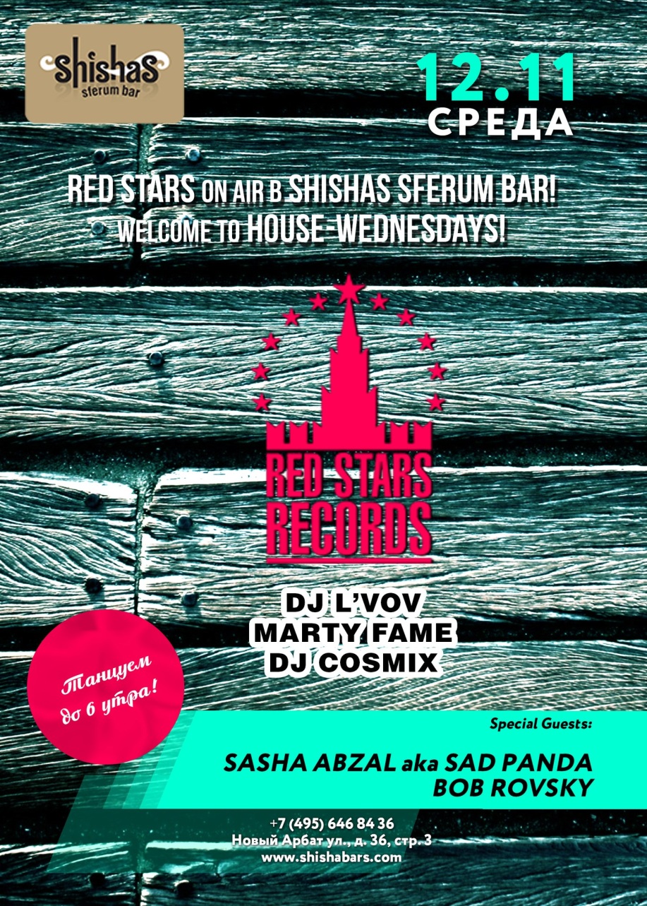 Red Stars On Air в Shishas Sferum Bar! Welcome to HOUSE-WEDNESDAYS! Открытие вечеринок самого авторитетного российского мультиформатного рекорд-лейбла России! СТОЛЫ - БЕЗ ДЕПОЗИТА!!! :) Shishas Sferum Bar и RED STARS RECORDS открывают HOUSE вечеринки по СРЕДАМ! Устали от банальной попсы, мэшапа и диско? Теперь у нас по СРЕДАМ с 23 часов только ХАУС! Welcome to HOUSE-WEDNESDAYS – Red Stars On Air в Shishas Sferum Bar! SPECIAL GUEST: SASHA ABZAL aka SAD PANDA, BOB ROVSKY На сегодняшний день RED STARS RECORDS – пожалуй, самый продуктивный и авторитетный мультиформатный проект на территории бывшего СССР. К лету 2014 года его каталог насчитывает 130 официальных мировых релизов и 120 неофициальных, а реестр вмещает в себя 134 саунд продюсера и вокалиста из России, Украины, Беларуси, Казахстана, Англии, Германии и США. В июне 2014 RED STARS RECORDS поставили абсолютный рекорд среди отечественных производителей – 30 официальных релизов за 30 дней! Лейбл не ограничивает себя стилистически и выпускает все актуальные течения house музыки. Отличительной чертой всех релизов стало стильное и качественное звучание, без излишнего упора на западные ориентиры и возврата к трендам давно минувших лет! Стартуем – каждую СРЕДУ с 23:00 и до 6 утра! HAPPY HOURS каждую СРЕДУ: