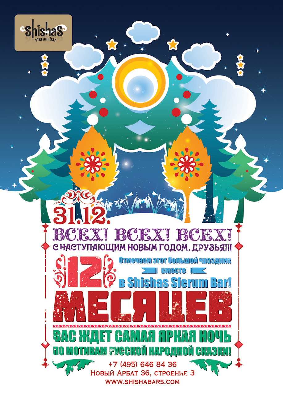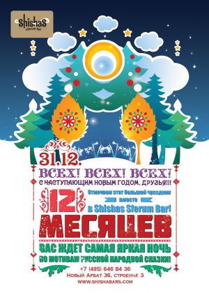 31 ДЕКАБРЯ 2014 – ДВЕНАДЦАТЬ МЕСЯЦЕВ в Shishas Sferum Bar! Грандиозная новогодняя ночь в самом атмосферном месте столицы! Новогодняя ночь… Волшебная ночь, полная тайн… Удивления и впечатления… И двенадцать прекрасных юношей, собравшихся у костра посреди заснеженного леса… Признайтесь, хочется погреться у их огонька и подслушать секретные разговоры? А может быть, кто-то из них подарит прекрасным незнакомкам букетики подснежников? Тогда добро пожаловать на волшебный Новый год в Shishas Sferum Bar на Новом Арбате – сказочное место, где сбываются все, даже самые смелые фантазии! Сегодня у нас правят бал… настоящие 12 месяцев! Декабрь, январь и февраль – заморозят для нас побольше бутылок с игристым шампанским и заботливо положат в коктейли кубики льда; март, апрель и май – накроют стол диковинными дарами природы – свежайшей рыбкой и ароматной дичью; июнь, июль и август – ответственны за сочные ягоды и фрукты; а сентябрь, октябрь и ноябрь – приготовят нам ароматные гарниры и вкуснейшие салаты из осенних овощей… Как Вам такой расклад, Друзья? Всех, всех, всех с наступающим Новым годом! Набирайтесь витаминов, позитива и радости на целый год вперед, поднимайте бокалы за самые сокровенные желания – все непременно сбудется! Обнимайтесь и целуйтесь, встречая праздник вместе с нами! Мы собрали для Вас самые яркие впечатления нашей высокоградусной ночной жизни – настолько крепкой, что она запросто растопит лед и на этом месте обязательно зацветут подснежники! С новым счастьем, Друзья! И давайте встретим его красиво и весело, то есть в Shishas Sferum Bar на Новом Арбате!