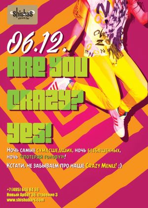 СУББОТА – 6 ДЕКАБРЯ 2014 – ARE YOU CRAZY? YES!!! в Shishas Sferum Bar! Сегодня тебе можно все!