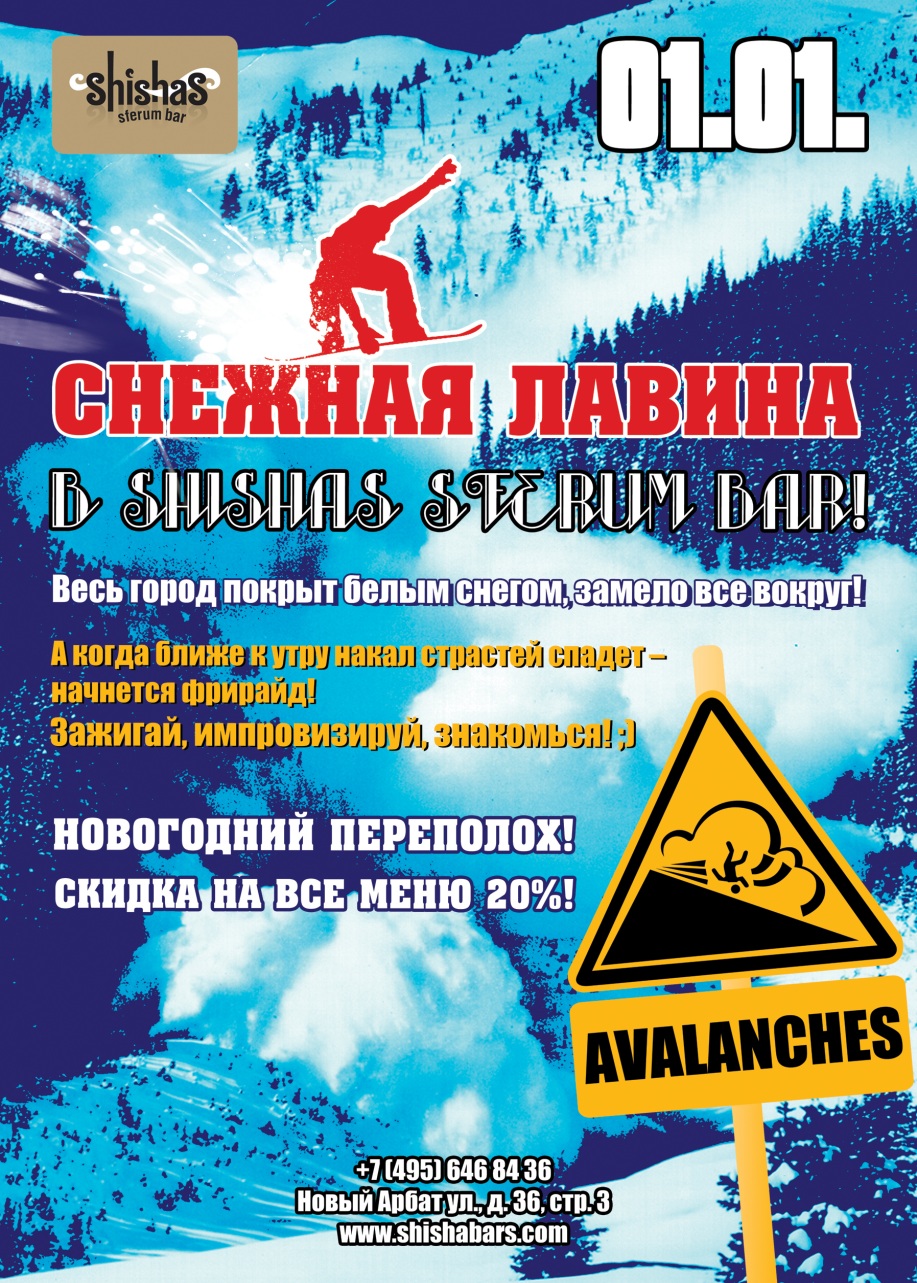 ЧЕТВЕРГ – 1 ЯНВАРЯ 2015 – СНЕЖНАЯ ЛАВИНА в Shishas Sferum Bar на Новом Арбате! Горячие волны страсти – всем лавинам назло! ВСЕ ПРАЗДНИКИ – СКИДКА 20% НА СЧЕТ! Весь город покрыт белым снегом, замело все вокруг! Слышите доносящийся грохот? Это мощная снежная лавина, надвигающаяся на нас чрезвычайно быстро... От нее, этой лавины, можно надежно укрыться в крепких стенах Shishas Sferum Bar на Новом Арбате! У нас крепки не только стены и дружественные связи: нет ничего приятнее, чем согреться от снега и льда крепкими и вкусными коктейлями под горячую закуску, которые в считанные минуты поставят Вас в строй! А после этого никакая лавина нам не страшна: наденем лыжи и костюм – и вперед, фрирайд! Полная импровизация приветствуется в Shishas Sferum Bar на Новом Арбате: танцуем, знакомимся, угощаемся и не забываем угощать! Растопим горячей волной страсти и танцев зимнюю столичную стужу, пусть кровь приятно побежит по всему телу, добавим чуточку допинга в виде пары коктейлей – и Вы снова в строю, всем лавинам назло!