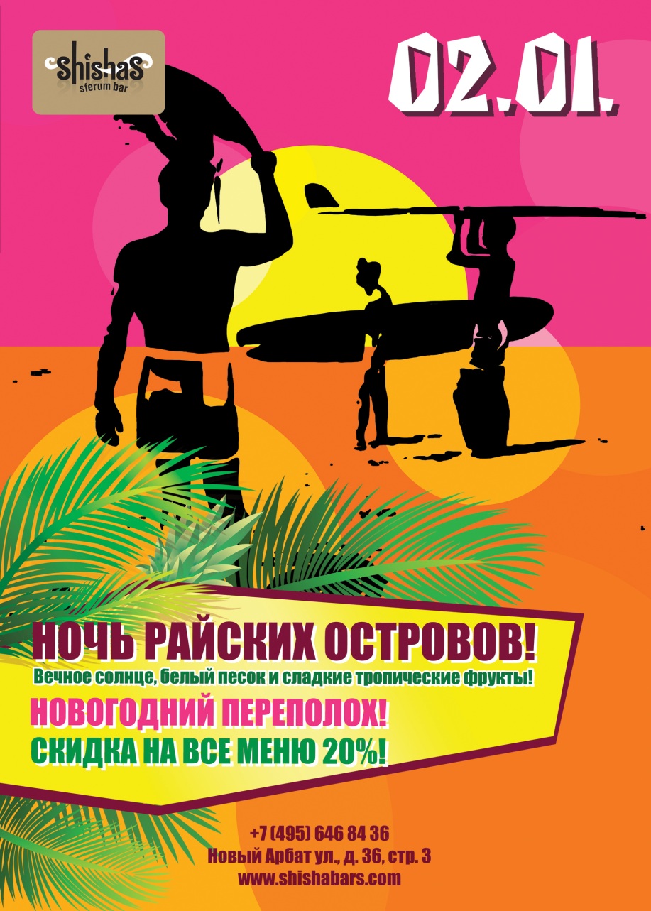 ПЯТНИЦА – 2 ЯНВАРЯ 2015 – НОЧЬ РАЙСКИХ ОСТРОВОВ в Shishas Sferum Bar на Новом Арбате! Жара райских островов в холодные морозы! ВСЕ ПРАЗДНИКИ – СКИДКА 20% НА СЧЕТ! Сезон отпусков рано или поздно случится, а в Shishas Sferum Bar на Новом Арбате он стартует уже сейчас: если не получается бросить все и укатить на Мальдивы, то, наверняка, получится заглянуть на пару часиков к нам на ночь райских островов! Мы гарантируем, что будет не менее жарко и даже влажно, чем в субтропиках – море обнаженных загорелых и очень соблазнительных форм, манящие костюмы невероятно ярких расцветок, бикини и короткие юбки, стройные ноги и глубокие декольте, дурманящие голову неземные напитки и нескромные танцы в заводных тропических ритмах, наверняка, заставят большинство из нас изрядно попотеть! Та-дам! Музыка – на всю катушку, двери – настежь, шампанское и фруктовые коктейли – рекой: наша тропическая пати проходит под правильным лозунгом «И хорошее настроение не покинет больше Вас!» :) Напоминаем, что в Shishas Sferum Bar на Новом Арбате продолжает действовать скидка 20% на все! И пусть Ваша душа поет, а глаз радуется – страстные тропические танцы, как на белом песке далеких островов, будут будоражить Вас сладкими воспоминаниями еще не один день! :)