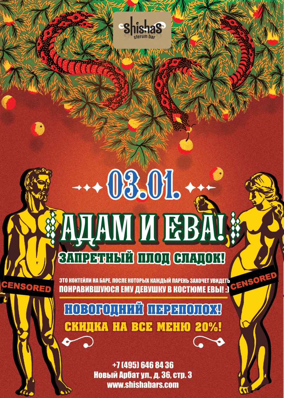 СУББОТА – 3 ЯНВАРЯ 2015 – АДАМ И ЕВА! ЗАПРЕТНЫЙ ПЛОД СЛАДОК в Shishas Sferum Bar на Новом Арбате! Самая пикантная ночь! ВСЕ ПРАЗДНИКИ – СКИДКА 20% НА СЧЕТ! Не исключено, что Вы берегли силы именно для этой вечеринки в Shishas Sferum Bar на Новом Арбате. Запретный плод безумно сладок, он манит своей спелостью и кружит голову ароматом, выбрасывая в кровь гигантские дозы гормонов... И всем им надо найти выход! Змей-искуситель, Адам и Ева подскажут Вам, как поступить, следуя природному инстинкту... Уже готовы к этому и не терпится приступить прямо сейчас? Для Вас – самая длинная, томная и пикантная ночь, недоступная для скромных и несовершеннолетних – где все абсолютно по-взрослому... Для тех, кто привык флиртовать и соблазнять, получать и дарить удовольствие, знакомиться и увлекаться, удивлять и удивляться... Пусть сегодня каждый Адам скажет своей Еве: все будет так, как ты захочешь – и выполнит это обещание! Наши запретные плоды в Shishas Sferum Bar на Новом Арбате – изысканные коктейли – доступны, как никогда, и после них у каждого Адама, наверняка, появится шанс увидеть свою девушку в костюме Евы! :) Спешите им воспользоваться!