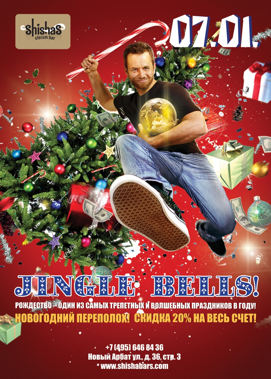 СРЕДА – 7 ЯНВАРЯ 2015 – JINGLE BELLS в Shishas Sferum Bar на Новом Арбате! Исполнение желаний – по мановению волшебной палочки! ВСЕ ПРАЗДНИКИ – СКИДКА 20% НА СЧЕТ! Сегодня Рождество – один из самых трепетных и волшебных праздников в году, когда за столом встречаются самые близкие Друзья! Мы, в Shishas Sferum Bar на Новом Арбате, заранее позаботились, чтобы в нашем гостеприимном баре Вы с первой минуты попадали в самую настоящую зимнюю сказку... Ее завораживающий сюжет пока останется в секрете, но Ваши желания, как по мановению волшебной палочки, начнут исполняться сразу после того, как Вы прочтете эти строки – гарантируем! Сказочные сюжеты, волшебные напитки, удивительное угощение, чудодейственные кальяны наполняют собой уникальное магическое пространство любимого праздника в Shishas Sferum Bar на Новом Арбате... Вокруг – чудеса, свежесть красок, феерия новогодних праздников... Давайте, запомним это Рождество, как одно из самых оригинальных, и помним, что атмосферу вечеринки создают ее Гости! Колокольчики уже звенят: не пора ли поднять бокалы?!