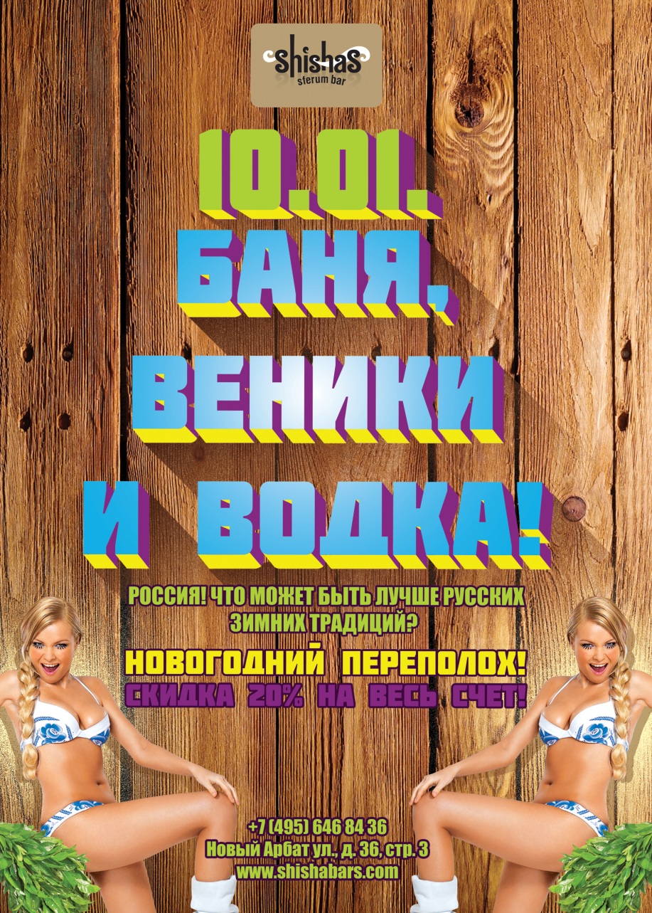 СУББОТА – 10 ЯНВАРЯ 2015 – БАНЯ, ВЕНИКИ И ВОДКА в Shishas Sferum Bar на Новом Арбате! Лучшая русская зимняя традиция! ВСЕ ПРАЗДНИКИ – СКИДКА 20% НА СЧЕТ! Россия! Что может быть лучше исконно русских зимних традиций? Выпьем водки у бара в Shishas Sferum Bar на Новом Арбате и распарим танцпол похлеще русской бани! Уверены, что нам не слабо – а потом ныряем прямо в сугроб, согласны? И можно повторить! К тому же зима просто немыслима без водки, лучшего русского горячительного напитка. Что может согреть так приятно и быстро, как стопка ледяной хорошей водки, да под красную икорочку или хрустящий соленый огурчик? Shishas Sferum Bar на Новом Арбате – настоящая баня, где патриотично отдают дань уважения качественному русскому напитку! Интересно, что только русская водка является классическим оригинальным напитком этого вида. И только русская водка гарантирует сохранение ясного ума и приподнятого настроения, несмотря на ее ядреную крепость. Ежели что не так – выльем таз воды, распарим банным веником и отнесем в сугроб! Наливай!