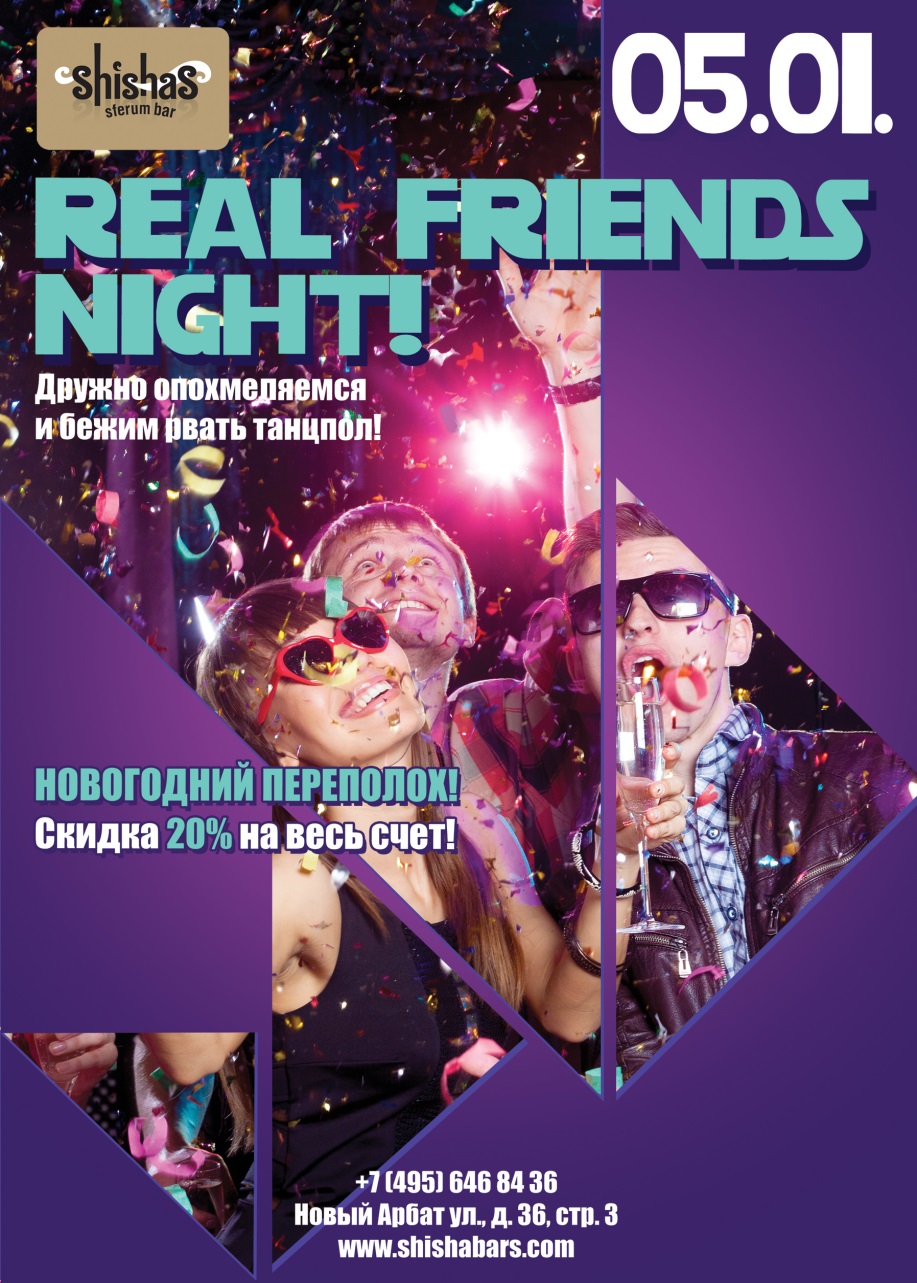 ПОНЕДЕЛЬНИК – 5 ЯНВАРЯ 2015 – REAL FRIENDS NIGHT! Дружно опохмеляемся и бежим рвать танцпол! ВСЕ ПРАЗДНИКИ – СКИДКА 20% НА СЧЕТ! Поговаривают, что Shishas Sferum Bar на Новом Арбате подкупил волшебников и организовал выгодную сделку с Дедом Морозом... Как и все сделки, совершаемые в последнее время, она вызвала как минимум НОВОГОДНИЙ ПЕРЕПОЛОХ! Но по этому поводу, в отличие от других, волноваться не стоит: в течение десяти новогодних дней Вас ожидает поднятие курса новогоднего настроения, высокая шкала радости, понижение цен на все меню на целых 20%, всевозможные выгодные акции, горячие рейтинги лично Вашей персоны, а также прочие разнообразные и приятные чудеса, которые будут случаться по поводу и без по адресу Новый Арбат ул., д. 36, стр. 3! Ждите музыкальных и гастрономических сюрпризов от группы, которая никогда не подводила – наших артистов, барменов, Go-Go и шеф-повара! На наших новогодних вечеринках Вы испытаете полный спектр положительных эмоций и удовольствия – от накала страстей и до ледникового периода, попадете под снежную лавину и попробуете запретный плод с Адамом и Евой, найдете не только новые приключения, но и новых друзей! Вкусные длинные ночи в Shishas Sferum Bar на Новом Арбате успели распробовать многие, но целая серия новогодних вечеринок, полных загадок, сюрпризов и экшна, перевернет Ваше представление о качественном и динамичном отдыхе, после которого нет нужды восстанавливать силы. Мы можем их только прибавить – своими улыбками, весельем, звоном бокалов и позитивным настроением! Приглашаем на Новогодний Переполох всех наших Гостей: давайте верить в чудо и... пора бронировать столики! Добро пожаловать в Shishas Sferum Bar на Новом Арбате!