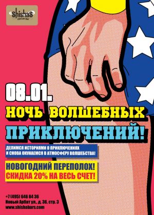 ЧЕТВЕРГ – 8 ЯНВАРЯ 2015 – НОЧЬ ВОЛШЕБНЫХ ПРИКЛЮЧЕНИЙ в Shishas Sferum Bar! Делимся историями о приключениях и снова окунаемся в атмосферу волшебства! ВСЕ ПРАЗДНИКИ – СКИДКА 20% НА СЧЕТ! Поговаривают, что Shishas Sferum Bar на Новом Арбате подкупил волшебников и организовал выгодную сделку с Дедом Морозом... Как и все сделки, совершаемые в последнее время, она вызвала как минимум НОВОГОДНИЙ ПЕРЕПОЛОХ! Но по этому поводу, в отличие от других, волноваться не стоит: в течение десяти новогодних дней Вас ожидает поднятие курса новогоднего настроения, высокая шкала радости, понижение цен на все меню на целых 20%, всевозможные выгодные акции, горячие рейтинги лично Вашей персоны, а также прочие разнообразные и приятные чудеса, которые будут случаться по поводу и без по адресу Новый Арбат ул., д. 36, стр. 3! Ждите музыкальных и гастрономических сюрпризов от группы, которая никогда не подводила – наших артистов, барменов, Go-Go и шеф-повара! На наших новогодних вечеринках Вы испытаете полный спектр положительных эмоций и удовольствия – от накала страстей и до ледникового периода, попадете под снежную лавину и попробуете запретный плод с Адамом и Евой, найдете не только новые приключения, но и новых друзей! Вкусные длинные ночи в Shishas Sferum Bar на Новом Арбате успели распробовать многие, но целая серия новогодних вечеринок, полных загадок, сюрпризов и экшна, перевернет Ваше представление о качественном и динамичном отдыхе, после которого нет нужды восстанавливать силы. Мы можем их только прибавить – своими улыбками, весельем, звоном бокалов и позитивным настроением! Приглашаем на Новогодний Переполох всех наших Гостей: давайте верить в чудо и... пора бронировать столики! Добро пожаловать в Shishas Sferum Bar на Новом Арбате!