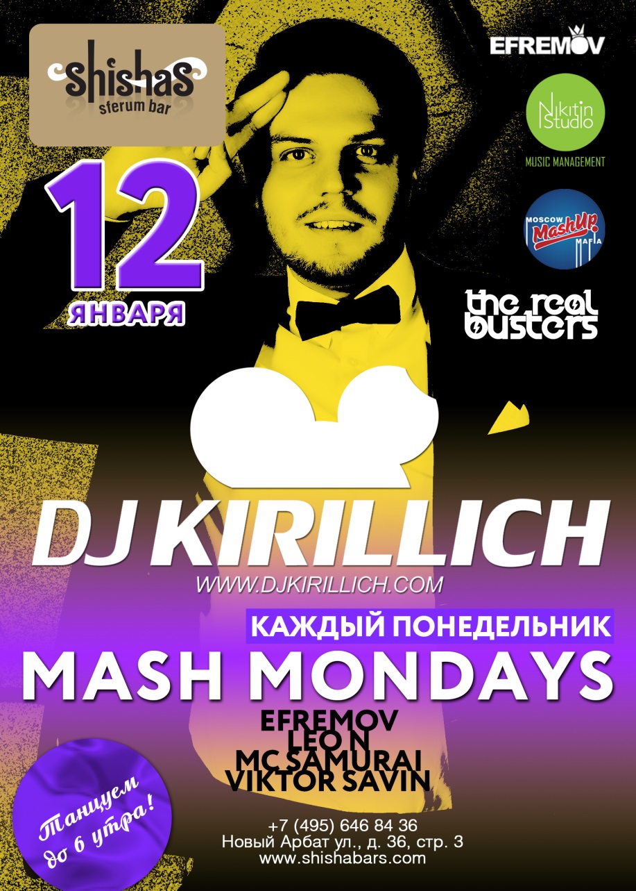 ПОНЕДЕЛЬНИК – 12 ЯНВАРЯ 2015: Mash Mondays в Shishas Sferum Bar! Отдыхаем до 6 утра и по ПОНЕДЕЛЬНИКАМ! СТОЛЫ БЕЗ ДЕПОЗИТОВ! SPECIAL GUEST: DJ KIRILLICH! Все вокруг только и говорят, что о клубном сезоне. А мы не говорим, мы его делаем и запускаем новый проект ПО ПОНЕДЕЛЬНИКАМ – Mash Mondays в Shishas Sferum Bar! Только лучший саунд, самые отборные треки, горячие GO-GO, заводные MC, крутые МЭШАП диджеи и, конечно, наши фирменные СУПЕР-ПУПЕР АКЦИИ на бар, кухню и кальяны!!! ПО ПОНЕДЕЛЬНИКАМ с 23:00 и до 6 утра отдыхаем и танцуем под ритмы: POP, HOUSE, BIGROOM, DISCO, RnB, DEEP и ELECTRO! Mash Mondays – это серия ярких ПОНЕДЕЛЬНИКОВ для тех, кто не успел отдохнуть в выходные или начинает неделю с тусы! Mash Mondays – это отличная возможность попасть на сеты известных МЭШАП диджеев в будний день! Mash Mondays – это ночной град танцевальных стилей и диджей сеты топовых музыкантов и артистов! Mash Mondays – это веселые компании, вкусные кальяны и сумасшедшие акции на баре! Shishas Bar – never sleeps!!! ;) Итак, теперь и в ПОНЕДЕЛЬНИК в Shishas Sferum Bar на Новом Арбате, Вам обеспечена отличная вечерина – Mash Mondays в Shishas Sferum Bar! HAPPY HOURS каждый ПОНЕДЕЛЬНИК: