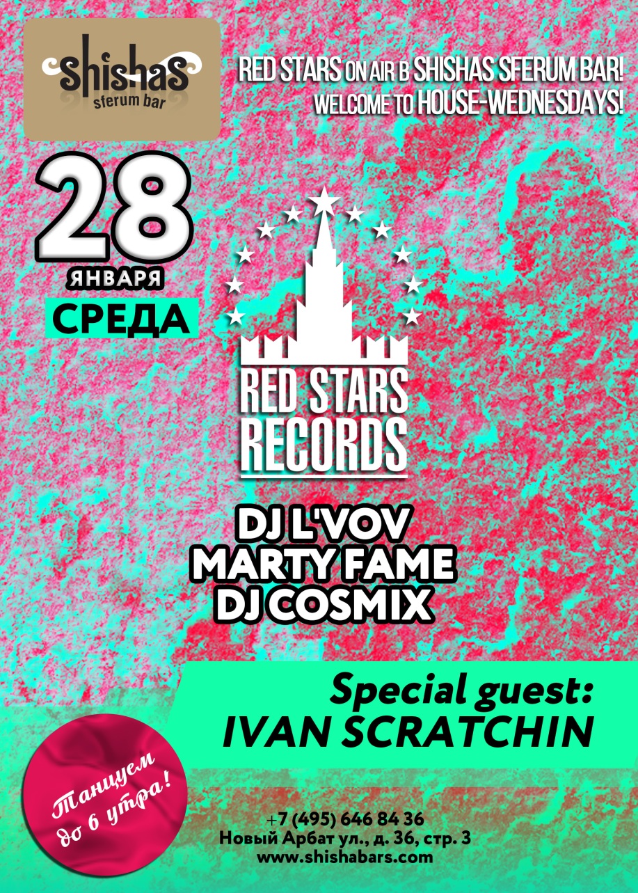 Red Stars On Air в Shishas Sferum Bar! Welcome to HOUSE-WEDNESDAYS! Открытие вечеринок самого авторитетного российского мультиформатного рекорд-лейбла России! SPECIAL GUEST: IVAN SCRATCHIN СТОЛЫ - БЕЗ ДЕПОЗИТА!!! :) Shishas Sferum Bar и RED STARS RECORDS открывают HOUSE вечеринки по СРЕДАМ! Устали от банальной попсы, мэшапа и диско? Теперь у нас по СРЕДАМ с 23 часов только ХАУС! Welcome to HOUSE-WEDNESDAYS – Red Stars On Air в Shishas Sferum Bar! На сегодняшний день RED STARS RECORDS – пожалуй, самый продуктивный и авторитетный мультиформатный проект на территории бывшего СССР. К лету 2014 года его каталог насчитывает 130 официальных мировых релизов и 120 неофициальных, а реестр вмещает в себя 134 саунд продюсера и вокалиста из России, Украины, Беларуси, Казахстана, Англии, Германии и США. В июне 2014 RED STARS RECORDS поставили абсолютный рекорд среди отечественных производителей – 30 официальных релизов за 30 дней! Лейбл не ограничивает себя стилистически и выпускает все актуальные течения house музыки. Отличительной чертой всех релизов стало стильное и качественное звучание, без излишнего упора на западные ориентиры и возврата к трендам давно минувших лет! Стартуем – каждую СРЕДУ с 23:00 и до 6 утра! HAPPY HOURS каждую СРЕДУ: