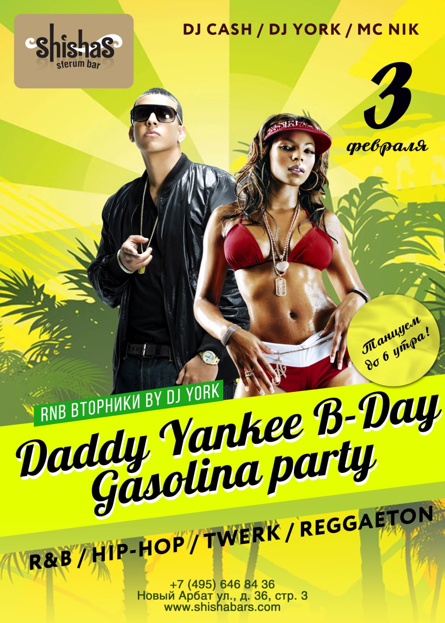 ВТОРНИК – Daddy Yankee B-Day Gasolina Party в Shishas Sferum Bar! ЛЕГЕНДАРНЫЕ R’N’B ВТОРНИКИ by DJ YORK! Зима – сезон безбашенных вечеринок, которые можно и нужно устраивать каждый вечер и не только по выходным! Пора волнующих романтичных закатов и очень скорых рассветов, которые особенно приятно встречать вместе с друзьями и любимыми под упругие ритмы качественной музыки и с ледяным коктейлем в руке! Не теряя мимолетного осеннего времени, мы запускаем старые добрые ЛЕГЕНДАРНЫЕ R’N’B ВТОРНИКИ by DJ YORK! DJ YORK (Влад Малинин) – абсолютный гуру и стопроцентный лидер множества чартов; персона, о который слышал почти каждый тусовщик! DJ YORK– пожалуй, один из самых востребованных MASH-UP, house и R’N’B диджеев России. Также он не чужд таких стилей, как Funky House, Soulfull & Nu-Disco. В любых музыкальных экспериментах у него найдутся свои фирменные «крючки» – он точно знает, как и чем «зацепить». Красивейшие и необычные треки, мэшапы и ремиксы, созданные с душой и вниманием – все это соединено грамотно и профессионально! Он неизменно не просто стоит за пультом, но показывает интересное шоу, живое выступление на виниле в реальном времени! Итак, отныне по ВТОРНИКАМ в Shishas Sferum Bar на Новом Арбате Вам обеспечена отличная музыка – R’N’B, Trap, Twerk, Dubstep, OldSchool – и неповторимая домашняя атмосфера, которой славятся бары сети Shishas Bar! Не забываем каждый вторник встречаться на танцполе, который будут взрывать наши любимые DJ York, DJ NickyJazz и MC Nik. Невероятные эмоции, позитив в чистом виде и безграничное общение – гарантированы! Танцуем, общаемся с друзьями, радуемся теплу и ловим момент под ритмы R’N’B – ведь лето только начинается! ЛЕГЕНДАРНЫЕ R’N’B ВТОРНИКИ в Shishas Sferum Bar открыты! Стартуем – каждый ВТОРНИК с 23:00 и до 6 утра!