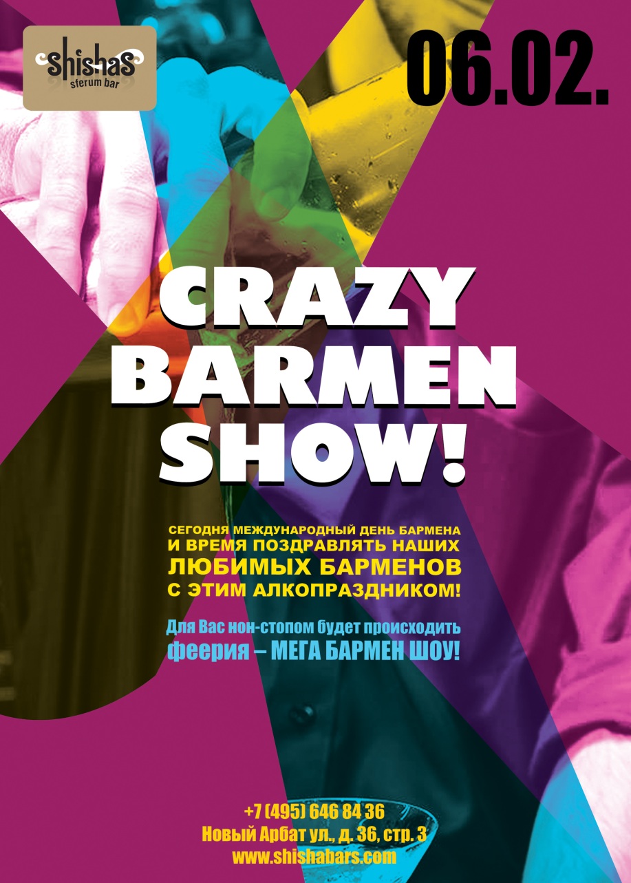 ПЯТНИЦА – 6 ФЕВРАЛЯ 2015 – CRAZY BARMEN SHOW в Shishas Sferum Bar на Новом Арбате! Замиксуй коктейль не хуже бармена! SPECIAL GUESTS: DJ REZNIKOV & CLUBKILLA Да, мы, конечно, умеем смешивать виски с колой у себя на кухне. Но посидеть со вкусом на кухне, как ни крути, не получится! Только настоящие бармены, как в Shishas Sferum Bar на Новом Арбате, умеют создавать такие алкогольные шедевры, после которых остается не острая головная боль, а изысканные воспоминания и тонкое послевкусие… Бармены стойко несут рабочую вахту все официальные выходные, пока мы расслабляемся, и оперативно реагируют на все наши закидоны. Наконец, настало их время – Международный день бармена, Господа! Поздравим же их с профессиональным праздником и разрешим делать то, что им так сильно нравится – устраивать шоу и танцевать за барной стойкой, на барной стойке и даже под барной стойкой! Мы уверены, что Вы, будучи постоянными Гостями Shishas Sferum Bar на Новом Арбате, наверняка, видели все эти феерические перфомансы, но сегодня ожидается нечто особенное – все самое лучшее, crème de la crème, мега–бармен шоу, которое будет нон-стопом нестись на протяжении всей ночи за обеими барными стойками! С праздником!