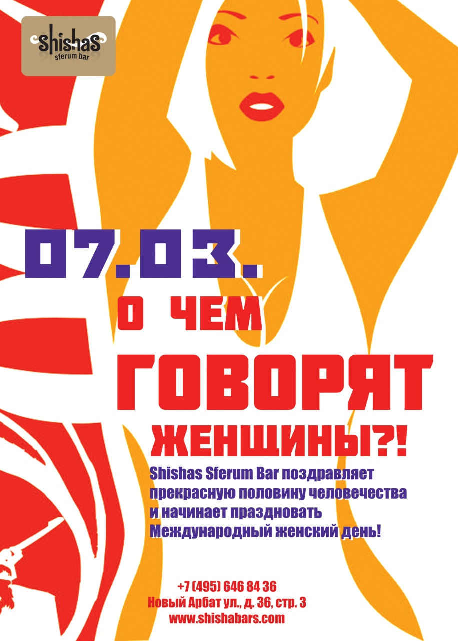 СУББОТА – 7 МАРТА 2015 – О чем говорят женщины?! Этот секрет мы раскроем в эту ночь в Shishas Sferum Bar на Новом Арбате! В ночь с 7 на 8 марта Shishas Sferum Bar на Новом Арбате поздравляет прекрасную половину человечества и начинает праздновать Международный женский день! О чем мечтают девушки, парням знать необязательно, но желательно! Как проведешь 8 марта, такую жизнь и заслужишь на оставшийся год! :) Но некоторые секреты лучше все же оставить в тайне, – например, как Вы нечаянно целовались с бойфрендом подруги или нечаянно капнули на ее платье чем-то неотстирываемым! Но правда бывает опасна для жизни, и Вашей подруге совсем необязательно знать, что она выглядит никудышно или ее глубокие морщины стали совсем безобразными! :) Даже если Вы, милые дамы, слегка зазеваетесь за барной стойкой в Shishas Sferum Bar на Новом Арбате и выболтаете сокровенные тайны, будьте спокойны – мы своих не сдаем! Тем более, что сегодня предлагается сплетничать вполне легально. Обсуждайте кривые ноги, силиконовые сиськи, заклятых подруг, постыдных мужей и страстных любовников – мы Вас пригласили специально для этого! :) Наши стены хранят гробовое молчание, а персонал настолько надежен, что может работать даже в Белом Доме! :) Поговорим наконец-то по душам, ведь накопилось, а?