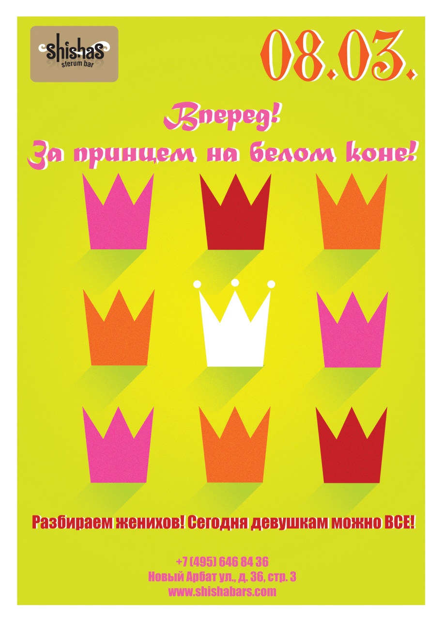 ВОСКРЕСЕНЬЕ – 8 МАРТА 2015 – Вперед! За принцем на белом коне в Shishas Sferum Bar на Новом Арбате! Разбираем женихов! Сегодня девушкам можно ВСЕ! С праздником, дорогие дамы! Сегодня вся ночь будет Вашей – полной сюрпризов, цветов, шампанского и подарков! Сегодня Вы, очаровательные девушки, – главные героини вечеринки в Shishas Sferum Bar на Новом Арбате! Праздничное настроение этой ночью будут создавать мужчины! И только сегодня любое желание станет реальным! Поскольку, как заявил арт-директор – девушкам можно ВСЕ, предлагаем не стесняться, а вплотную заняться своей личной жизнью! Когда, если не сейчас? Ни одна девушка не должна остаться без внимания и без своего принца! Для тех, кто пока не нашел ЕГО, или чей принц сегодня, по закону подлости, накосячил – Shishas Sferum Bar на Новом Арбате объявляет благотворительную выставку самых завидных холостяков столицы! :) Выбирайте, девушки, – принца можно забрать с собой в любом состоянии и совершенно бесплатно! :) Такой вот бонус Вы отхватите к фирменному коктейлю! :) Сегодня Ваш день, и ни один мужчина на свете не осмелится не ответить Вам взаимностью! А за его подготовку мы беремся лично! :)