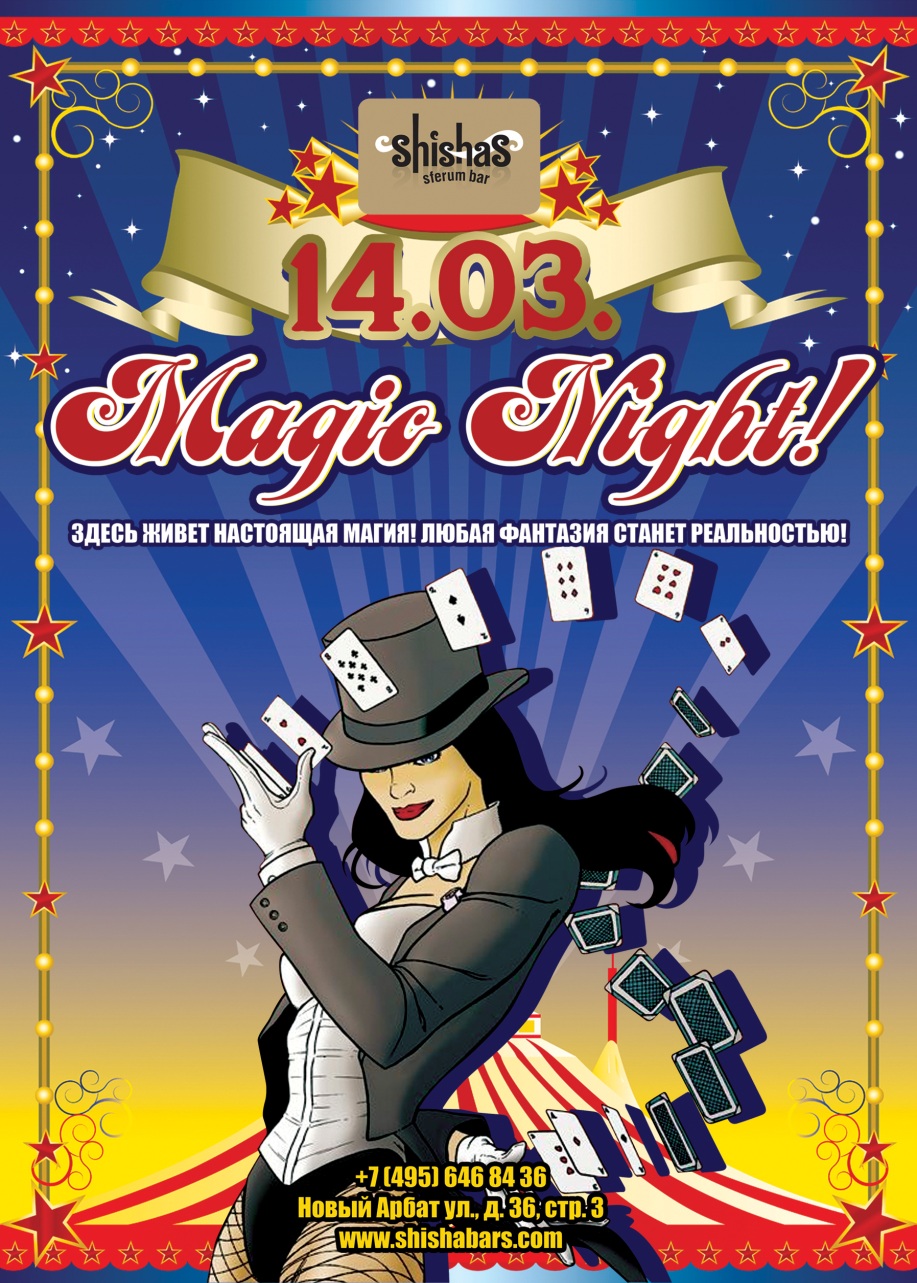 СУББОТА – 14 МАРТА 2015 – Magic Night в Shishas Sferum Bar на Новом Арбате! Здесь живет настоящая магия! Любая фантазия станет реальностью! Сегодня ночь волшебства и магии, полная загадок и мистических совпадений! Устали от однообразной рутины и не клеятся дела? Обращайтесь к проверенному способу – магии нашего бара Shishas Sferum Bar на Новом Арбате, который хотя бы на одну ночь решит все Ваши проблемы! Итак, Друзья, в каждой минуте времени, проведенного у нас, – кусочек столь желанного волшебства, которое исполняет желания! Надеетесь на мистические совпадения – они будут у Вас: девушки, наверняка, повстречают своих принцев, а парни – принцесс! Ваши желания и мысли совпадут, как цветные стеклышки в причудливом калейдоскопе, образовав удивительный рисунок из чувственной любви и страсти. Каждый узнает пожелания на будущее и погадает на судьбу. Все хорошее непременно сбудется – тем более этой ночью, полной звезд, когда чудом и загадками дышит каждая минута! Надо всего лишь верить в чудо и не забыть забронировать столик в Shishas Sferum Bar на Новом Арбате! Неожиданные перевоплощения, хитрые фокусы, захватывающие зрелища и много разных чудес! До утра бар превратится в яркое шапито, полное сюрпризов и загадок! Отдайтесь во власть неизвестного, и фортуна Вам улыбнется!
