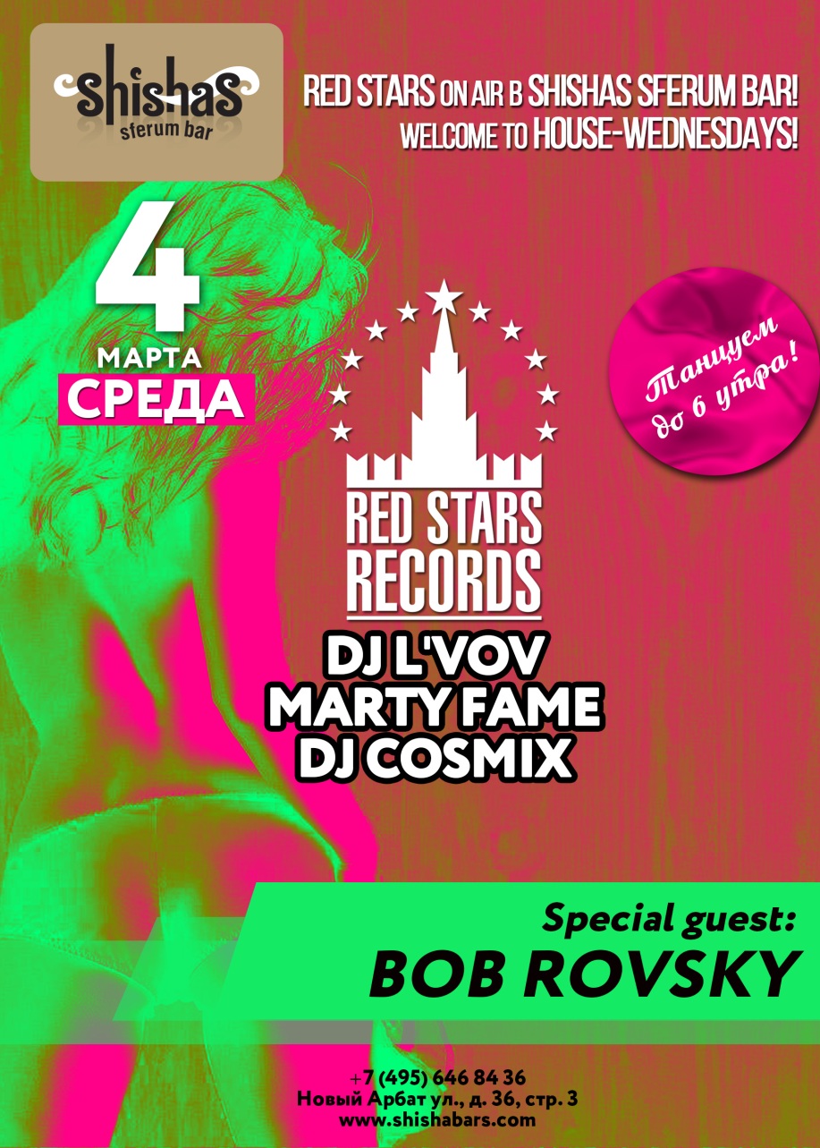СРЕДА – 4 МАРТА 2015 – Red Stars On Air в Shishas Sferum Bar! Welcome to HOUSE-WEDNESDAYS! SPECIAL GUESTS: BOB ROVSKY! СТОЛЫ - БЕЗ ДЕПОЗИТА!!! :) Shishas Sferum Bar и RED STARS RECORDS открывают HOUSE вечеринки по СРЕДАМ! Устали от банальной попсы, мэшапа и диско? Теперь у нас по СРЕДАМ с 23 часов только ХАУС! Welcome to HOUSE-WEDNESDAYS – Red Stars On Air в Shishas Sferum Bar! На сегодняшний день RED STARS RECORDS – пожалуй, самый продуктивный и авторитетный мультиформатный проект на территории бывшего СССР. К лету 2014 года его каталог насчитывает 130 официальных мировых релизов и 120 неофициальных, а реестр вмещает в себя 134 саунд продюсера и вокалиста из России, Украины, Беларуси, Казахстана, Англии, Германии и США. В июне 2014 RED STARS RECORDS поставили абсолютный рекорд среди отечественных производителей – 30 официальных релизов за 30 дней! Лейбл не ограничивает себя стилистически и выпускает все актуальные течения house музыки. Отличительной чертой всех релизов стало стильное и качественное звучание, без излишнего упора на западные ориентиры и возврата к трендам давно минувших лет! Стартуем – каждую СРЕДУ с 23:00 и до 6 утра! HAPPY HOURS каждую СРЕДУ: