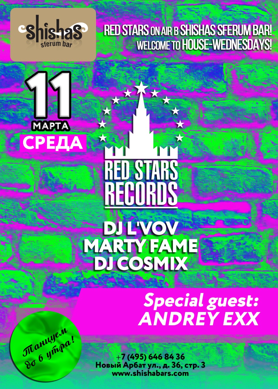 СРЕДА – 4 МАРТА 2015 – Red Stars On Air в Shishas Sferum Bar! Welcome to HOUSE-WEDNESDAYS! SPECIAL GUESTS: ANDREY EXX! СТОЛЫ - БЕЗ ДЕПОЗИТА!!! :) Shishas Sferum Bar и RED STARS RECORDS открывают HOUSE вечеринки по СРЕДАМ! Устали от банальной попсы, мэшапа и диско? Теперь у нас по СРЕДАМ с 23 часов только ХАУС! Welcome to HOUSE-WEDNESDAYS – Red Stars On Air в Shishas Sferum Bar! На сегодняшний день RED STARS RECORDS – пожалуй, самый продуктивный и авторитетный мультиформатный проект на территории бывшего СССР. К лету 2014 года его каталог насчитывает 130 официальных мировых релизов и 120 неофициальных, а реестр вмещает в себя 134 саунд продюсера и вокалиста из России, Украины, Беларуси, Казахстана, Англии, Германии и США. В июне 2014 RED STARS RECORDS поставили абсолютный рекорд среди отечественных производителей – 30 официальных релизов за 30 дней! Лейбл не ограничивает себя стилистически и выпускает все актуальные течения house музыки. Отличительной чертой всех релизов стало стильное и качественное звучание, без излишнего упора на западные ориентиры и возврата к трендам давно минувших лет! Стартуем – каждую СРЕДУ с 23:00 и до 6 утра! HAPPY HOURS каждую СРЕДУ: