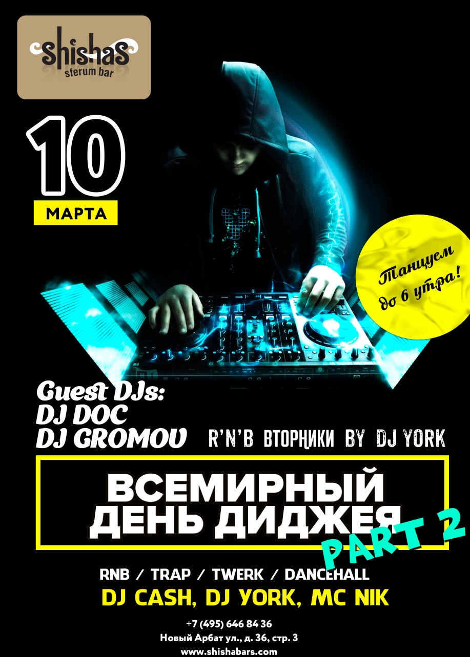 ВТОРНИК – ВСЕМИРНЫЙ ДЕНЬ ДИДЖЕЯ part 2 в Shishas Sferum Bar! ЛЕГЕНДАРНЫЕ R’N’B ВТОРНИКИ by DJ YORK! Guests DJ: DJ DOC & DJ GROMOV Весна – сезон безбашенных вечеринок, которые можно и нужно устраивать каждый вечер и не только по выходным! Пора волнующих романтичных закатов и очень скорых рассветов, которые особенно приятно встречать вместе с друзьями и любимыми под упругие ритмы качественной музыки и с ледяным коктейлем в руке! Не теряя мимолетного осеннего времени, мы запускаем старые добрые ЛЕГЕНДАРНЫЕ R’N’B ВТОРНИКИ by DJ YORK! DJ YORK (Влад Малинин) – абсолютный гуру и стопроцентный лидер множества чартов; персона, о который слышал почти каждый тусовщик! DJ YORK– пожалуй, один из самых востребованных MASH-UP, house и R’N’B диджеев России. Также он не чужд таких стилей, как Funky House, Soulfull & Nu-Disco. В любых музыкальных экспериментах у него найдутся свои фирменные «крючки» – он точно знает, как и чем «зацепить». Красивейшие и необычные треки, мэшапы и ремиксы, созданные с душой и вниманием – все это соединено грамотно и профессионально! Он неизменно не просто стоит за пультом, но показывает интересное шоу, живое выступление на виниле в реальном времени! Итак, отныне по ВТОРНИКАМ в Shishas Sferum Bar на Новом Арбате Вам обеспечена отличная музыка – R’N’B, Trap, Twerk, Dubstep, OldSchool – и неповторимая домашняя атмосфера, которой славятся бары сети Shishas Bar! Не забываем каждый вторник встречаться на танцполе, который будут взрывать наши любимые DJ York, DJ NickyJazz и MC Nik. Невероятные эмоции, позитив в чистом виде и безграничное общение – гарантированы! Танцуем, общаемся с друзьями, радуемся теплу и ловим момент под ритмы R’N’B – ведь весна только начинается! ЛЕГЕНДАРНЫЕ R’N’B ВТОРНИКИ в Shishas Sferum Bar открыты! Стартуем – каждый ВТОРНИК с 23:00 и до 6 утра!