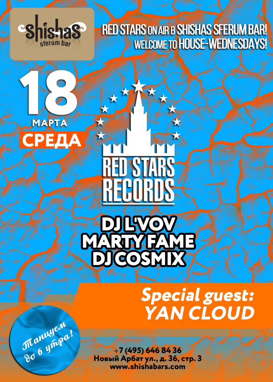 СРЕДА – 18 МАРТА 2015 – Red Stars On Air в Shishas Sferum Bar! Welcome to HOUSE-WEDNESDAYS! SPECIAL GUESTS: YAN CLOUD! СТОЛЫ - БЕЗ ДЕПОЗИТА!!! :) Shishas Sferum Bar и RED STARS RECORDS открывают HOUSE вечеринки по СРЕДАМ! Устали от банальной попсы, мэшапа и диско? Теперь у нас по СРЕДАМ с 23 часов только ХАУС! Welcome to HOUSE-WEDNESDAYS – Red Stars On Air в Shishas Sferum Bar! На сегодняшний день RED STARS RECORDS – пожалуй, самый продуктивный и авторитетный мультиформатный проект на территории бывшего СССР. К лету 2014 года его каталог насчитывает 130 официальных мировых релизов и 120 неофициальных, а реестр вмещает в себя 134 саунд продюсера и вокалиста из России, Украины, Беларуси, Казахстана, Англии, Германии и США. В июне 2014 RED STARS RECORDS поставили абсолютный рекорд среди отечественных производителей – 30 официальных релизов за 30 дней! Лейбл не ограничивает себя стилистически и выпускает все актуальные течения house музыки. Отличительной чертой всех релизов стало стильное и качественное звучание, без излишнего упора на западные ориентиры и возврата к трендам давно минувших лет! Стартуем – каждую СРЕДУ с 23:00 и до 6 утра! HAPPY HOURS каждую СРЕДУ: