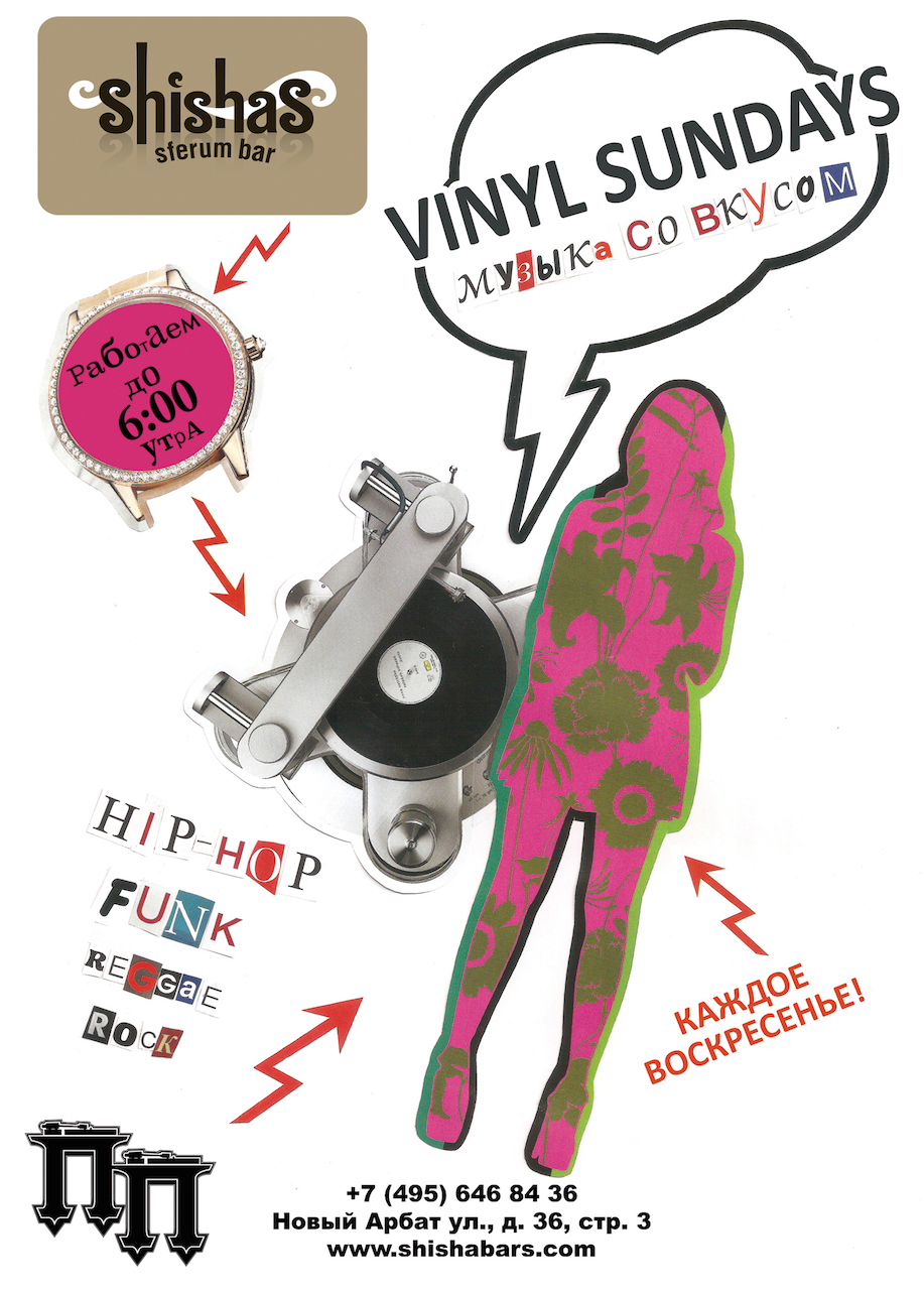 ВОСКРЕСЕНЬЕ – 22 МАРТА 2015 – VINYL SUNDAYS в Shishas Sferum Bar на Новом Арбате! ТОЛЬКО ПЛАСТИНКИ И ВИНИЛОВЫЙ САУНД по воскресеньям! КРУТЫЕ АКЦИИ на бар и кальяны до 6 утра! Дорогие Друзья, каждое воскресенье, начиная с 22 марта, Shishas Sferum Bar на Новом Арбате и PATIPIPL, приглашают Вас получить мощный заряд позитивной энергии перед рабочими буднями! Вас ждет изобилие интересной и качественной музыки различных направлений, от увесистых ритмов фанка и до мелодичного даунтемпо! Откройте для себя живую музыкальную энциклопедию, которая отправит Вас в путешествие по волнам грува и кача. Каждое воскресенье в ShishasSferumBar на Новом Арбате Вы услышите изысканный стильный звук ВИНИЛА, с лёгким потрескиванием, который будет проникать в Вас вместе со сладким дымом кальяна в течение всей ночи! PATIPIPL – это команда музыкантов, граффитчиков, дизайнеров и представителей уникального исчезающего вида DJ-еев, владеющих техникой игры на виниле! Эти ребята смогут сделать Ваше воскресенье в ShishasSferum Bar на Новом Арбате самым запоминающимся событием недели! Наша команда ПО ВОСКРЕСЕНЬЯМ: