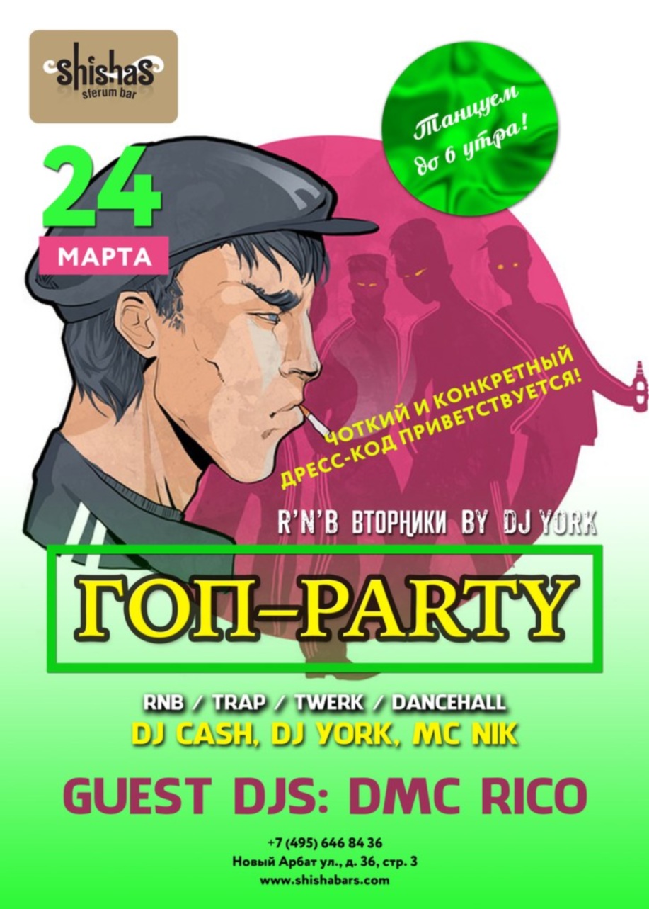 ВТОРНИК – ГОП - PARTY в Shishas Sferum Bar! ЛЕГЕНДАРНЫЕ R’N’B ВТОРНИКИ by DJ YORK! GUEST DJs: DMC & RICO! Весна – сезон безбашенных вечеринок, которые можно и нужно устраивать каждый вечер и не только по выходным! Пора волнующих романтичных закатов и очень скорых рассветов, которые особенно приятно встречать вместе с друзьями и любимыми под упругие ритмы качественной музыки и с ледяным коктейлем в руке! Не теряя мимолетного осеннего времени, мы запускаем старые добрые ЛЕГЕНДАРНЫЕ R’N’B ВТОРНИКИ by DJ YORK! DJ YORK (Влад Малинин) – абсолютный гуру и стопроцентный лидер множества чартов; персона, о который слышал почти каждый тусовщик! DJ YORK– пожалуй, один из самых востребованных MASH-UP, house и R’N’B диджеев России. Также он не чужд таких стилей, как Funky House, Soulfull & Nu-Disco. В любых музыкальных экспериментах у него найдутся свои фирменные «крючки» – он точно знает, как и чем «зацепить». Красивейшие и необычные треки, мэшапы и ремиксы, созданные с душой и вниманием – все это соединено грамотно и профессионально! Он неизменно не просто стоит за пультом, но показывает интересное шоу, живое выступление на виниле в реальном времени! Итак, отныне по ВТОРНИКАМ в Shishas Sferum Bar на Новом Арбате Вам обеспечена отличная музыка – R’N’B, Trap, Twerk, Dubstep, OldSchool – и неповторимая домашняя атмосфера, которой славятся бары сети Shishas Bar! Не забываем каждый вторник встречаться на танцполе, который будут взрывать наши любимые DJ York, DJ NickyJazz и MC Nik. Невероятные эмоции, позитив в чистом виде и безграничное общение – гарантированы! Танцуем, общаемся с друзьями, радуемся теплу и ловим момент под ритмы R’N’B – ведь весна только начинается! ЛЕГЕНДАРНЫЕ R’N’B ВТОРНИКИ в Shishas Sferum Bar открыты! Стартуем – каждый ВТОРНИК с 23:00 и до 6 утра! HAPPY HOURS каждый ВТОРНИК: