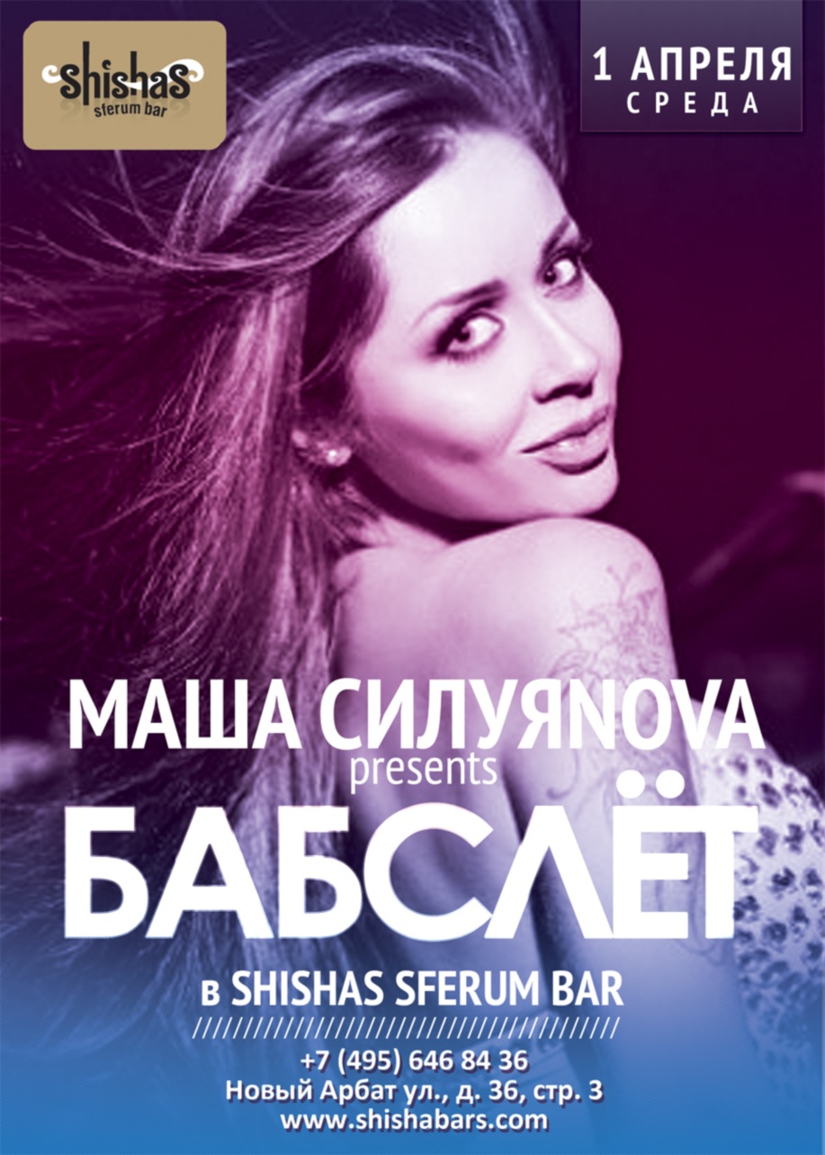 СРЕДА – 1 АПРЕЛЯ 2015 – БАБСЛЕТ by DJ МАША СИЛУЯNOVA в Shishas Sferum Bar на Новом Арбате! Отдыхаем красиво и до 6 утра! СТОЛЫ БЕЗ ДЕПОЗИТОВ! 1 апреля – среда в Shishas Sferum Bar на Новом Арбате объявляется антигламурной! Инициатор массовых беспорядков – знаменитая королева эпатажа DJ Маша СИЛУЯNOVA! Эта дива танцпола сделает все для того, чтобы Вам сорвало башню – ведь такого массового помешательства Вы еще не видели! В чем же интрига? Бабслет – это вовсе не слет глиняных и силиконовых девчонок на халявные коктейли! Это безбашенная вечеринка, центром внимания которой станут самые известные медийные личности! Они предстанут для Вас в новом качестве, откроются с других сторон, о которых Вы даже не догадывались. Все перевернется с ног на голову и мир уже никогда не станет прежним. Скандальные группы и селебрити, супермодели, поп-звезды, рэперы, модные диджеи и телеведущие – все, кого Вы так пристально разглядывали в телеке и на Youtube, в один миг окажутся за диджейским пультом или даже за барной стойкой! А может, Вы наберетесь смелости и пригласите их к себе в компанию? В общем, запасайтесь гаджетами – делайте фотки и селфи, не забывайте маркер для автографов и всех своих друзей для отличной компании! Но помните, что гламуру здесь не место, не смотря на наличие пригламуренной и сексапильной Маши СИЛУЯNOVой! Только треш, только угар, достойный самых замусоленных страниц желтой прессы! Напрягите свое воображение! Все на Бабслет в Shishas Sferum Bar на Новом Арбате – открываем сумасшедшие среды в день смеха, 1 апреля, - хорошо смеется тот, кто танцует до 6 утра! :) Стартуем – каждую СРЕДУ с 23:00 и до 6 утра! Non-stop DJ set от резидентов: 18:00-06:00 Sexy Go-Go Ladies: 00:00-04:00 *********************************************************************** При заказе стола от 8-ми человек – бутылка итальянского игристого В ПОДАРОК! День Рождения? Дарим скидку 20% на ВЕСЬ счет! :) Отметь День Рождение в Shishas Sferum Bar: получи скидку 20% на весь счет! Happy Hours каждую СРЕДУ: