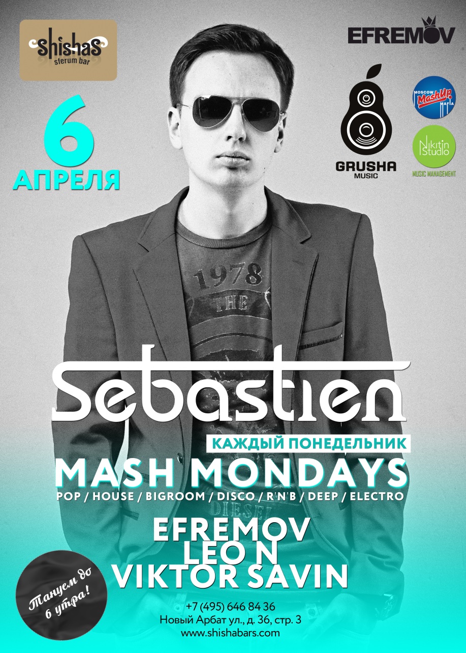 ПОНЕДЕЛЬНИК – 6 АПРЕЛЯ 2015 – Mash Mondays в Shishas Sferum Bar! Отдыхаем до 6 утра и по ПОНЕДЕЛЬНИКАМ! СТОЛЫ БЕЗ ДЕПОЗИТОВ! SPECIAL GUEST: DJ SEBASTIEN! Все вокруг только и говорят, что о клубном сезоне. А мы не говорим, мы его делаем и запускаем новый проект ПО ПОНЕДЕЛЬНИКАМ – Mash Mondays в Shishas Sferum Bar! Только лучший саунд, самые отборные треки, горячие GO-GO, заводные MC, крутые МЭШАП диджеи и, конечно, наши фирменные СУПЕР-ПУПЕР АКЦИИ на бар, кухню и кальяны!!! ПО ПОНЕДЕЛЬНИКАМ с 23:00 и до 6 утра отдыхаем и танцуем под ритмы: POP, HOUSE, BIGROOM, DISCO, RnB, DEEP и ELECTRO! Mash Mondays – это серия ярких ПОНЕДЕЛЬНИКОВ для тех, кто не успел отдохнуть в выходные или начинает неделю с тусы! Mash Mondays – это отличная возможность попасть на сеты известных МЭШАП диджеев в будний день! Mash Mondays – это ночной град танцевальных стилей и диджей сеты топовых музыкантов и артистов! Mash Mondays – это веселые компании, вкусные кальяны и сумасшедшие акции на баре! Shishas Bar – never sleeps!!! ;) Итак, теперь и в ПОНЕДЕЛЬНИК в Shishas Sferum Bar на Новом Арбате, Вам обеспечена отличная вечерина – Mash Mondays в Shishas Sferum Bar! HAPPY HOURS каждый ПОНЕДЕЛЬНИК: