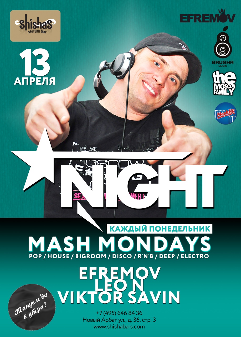 ПОНЕДЕЛЬНИК – 13 АПРЕЛЯ 2015 – Mash Mondays в Shishas Sferum Bar! Отдыхаем до 6 утра и по ПОНЕДЕЛЬНИКАМ! СТОЛЫ БЕЗ ДЕПОЗИТОВ! SPECIAL GUEST: DJ NIGHT! Все вокруг только и говорят, что о клубном сезоне. А мы не говорим, мы его делаем и запускаем новый проект ПО ПОНЕДЕЛЬНИКАМ – Mash Mondays в Shishas Sferum Bar! Только лучший саунд, самые отборные треки, горячие GO-GO, заводные MC, крутые МЭШАП диджеи и, конечно, наши фирменные СУПЕР-ПУПЕР АКЦИИ на бар, кухню и кальяны!!! ПО ПОНЕДЕЛЬНИКАМ с 23:00 и до 6 утра отдыхаем и танцуем под ритмы: POP, HOUSE, BIGROOM, DISCO, RnB, DEEP и ELECTRO! Mash Mondays – это серия ярких ПОНЕДЕЛЬНИКОВ для тех, кто не успел отдохнуть в выходные или начинает неделю с тусы! Mash Mondays – это отличная возможность попасть на сеты известных МЭШАП диджеев в будний день! Mash Mondays – это ночной град танцевальных стилей и диджей сеты топовых музыкантов и артистов! Mash Mondays – это веселые компании, вкусные кальяны и сумасшедшие акции на баре! Shishas Bar – never sleeps!!! ;) Итак, теперь и в ПОНЕДЕЛЬНИК в Shishas Sferum Bar на Новом Арбате, Вам обеспечена отличная вечерина – Mash Mondays в Shishas Sferum Bar! HAPPY HOURS каждый ПОНЕДЕЛЬНИК: