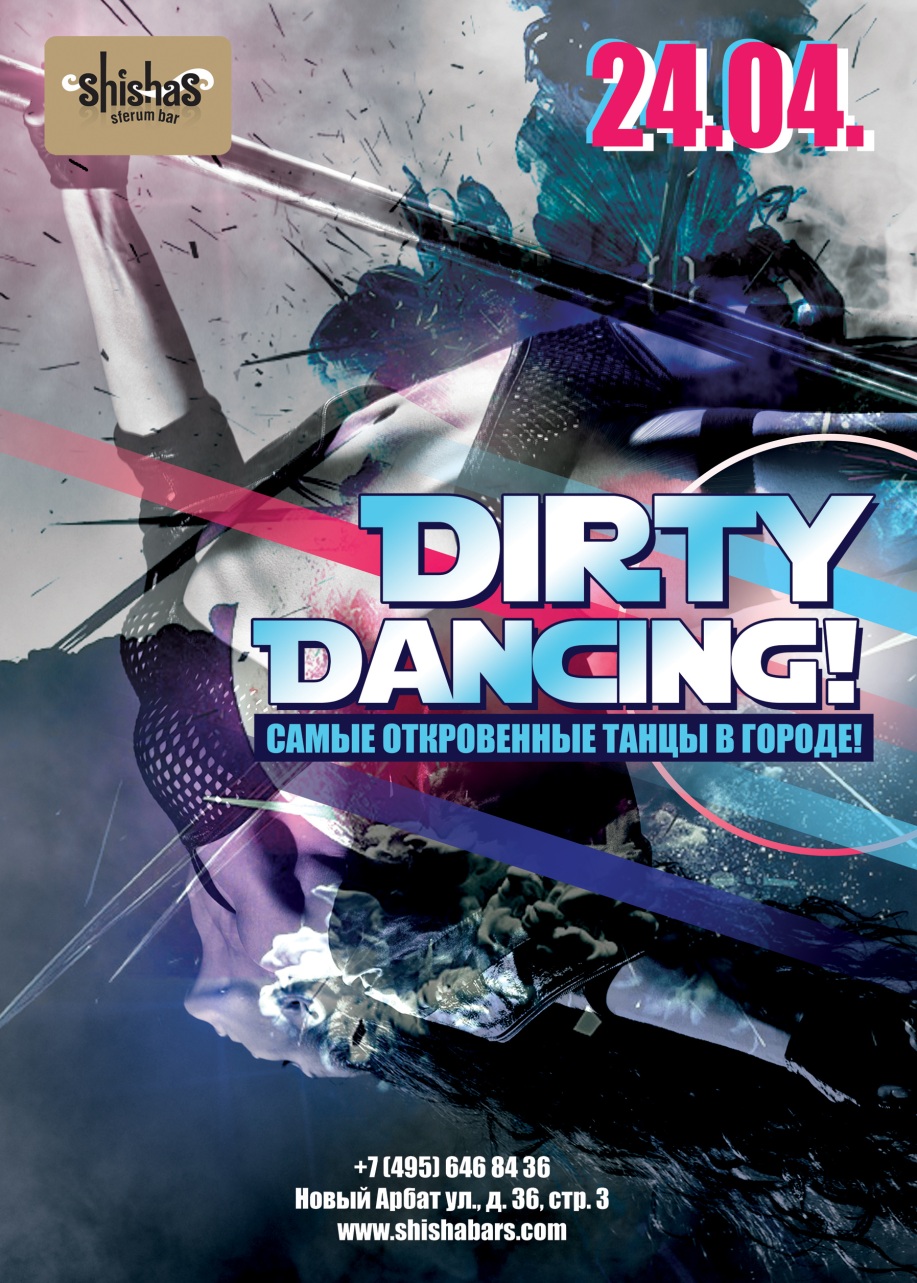 ПЯТНИЦА – 24 АПРЕЛЯ 2015 – Dirty Dancing в Shishas Sferum Bar на Новом Арбате!Самые откровенные танцы в городе! Когда-то «Грязные танцы» были самой популярной темой в мире, а само название фильма привлекало и интриговало, словно настраивая на запретные удовольствия! Этими удовольствиями, как ни странно, для главных героев были не только любовь, но и самые настоящие танцы – но такие, что приличные люди впадали в ступор и заливались краской. Кто подзабыл, что такое грязные танцы, и кто такие Джонни и Бэйби, приглашаем на вечеринку в Shishas Sferum Bar на Новом Арбате в честь культового фильма! Насладимся мотивом песни I've Had The Time of My Life, вспомним легендарную фразу: «Никто больше не посадит Бэйби в угол», и даже одним глазком посмотрим кадры из картины «Dirty Dancing», ставшей мировой классикой. А те, кто не в теме – пусть танцуют грязные танцы так, как умеют! Ведь в Shishas Sferum Bar на Новом Арбате никогда не запрещалось немного похулиганить! :)