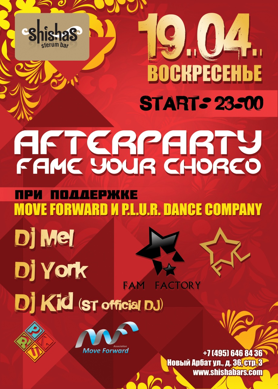 ВОСКРЕСЕНЬЕ – 19 АПРЕЛЯ 2015 – AFTERPARTY масштабного танцевального чемпионата FAME YOUR CHOREO при поддержке MOVE FORWARD и P.L.U.R. DANCE COMPANY в Shishas Sferum Bar на Новом Арбате! Все танцоры страны – расслабляйтесь и отрывайтесь! 17 – 19 АПРЕЛЯ 2015 пройдут безвозмездный прокач мастер-классов от звезд российского jazz-funk и масштабный танцевальный чемпионат FAME YOUR CHOREO, которые объединят под одной крышей множество танцоров! На площадках танцоры будут сражаться за звание лучших! Самые компетентные, всемирно известные российские судьи соберутся в Москве, чтобы определить победителей в различных номинациях. Друзья, мы рады Вам сообщить, что в это воскресенье 19 апреля состоится еще одна вечеринка, приуроченная к крупному танцевальному событию нашей страны! После такого насыщенного танцевального чемпионата, необходим полный физический и душевный отрыв! :) Fam Factory при поддержке Move Forward и P.L.U.R. Dance Company приглашают Вас на официальное AFTERPARTY чемпионата в Shishas Sferum Bar на Новом Арбате! Соберется множество танцоров со всей России вне зависимости от танцевальных пристрастий, с одной целью – ОТЛИЧНО ПРОВЕСТИ НОЧЬ в любимом месте, наполнить ее зажигательными танцами, музыкой и общением! У Вас будет возможность в неформальной обстановке познакомиться и обменяться мнениями с Гостями мероприятия, пообщаться с судьями и участниками! Даже если Вы не были на самом чемпионате – никогда не поздно влиться в тусовку лучших танцовщиков! Своими глазами увидеть их не на сцене, а в реальной жизни, на танцполе. Этой ночью в Shishas Sferum Bar на Новом Арбате будет очень горячо и сексуально! Большой танцпол, приятная атмосфера, супер акции на меню, любимые треки, доброжелательные улыбки, ведь это Shishas Sferum Bar – пожалуй, лучшая атмосфера в городе! START: 23:00 ВХОД: FREE 18+ При себе ОБЯЗАТЕЛЬНО иметь Паспорт, во избежание неприятных ситуаций на входе! Всю ночь для Вас будут играть лучшие диджеи Москвы, которые не дадут Вам сидеть на мягком диванчике: