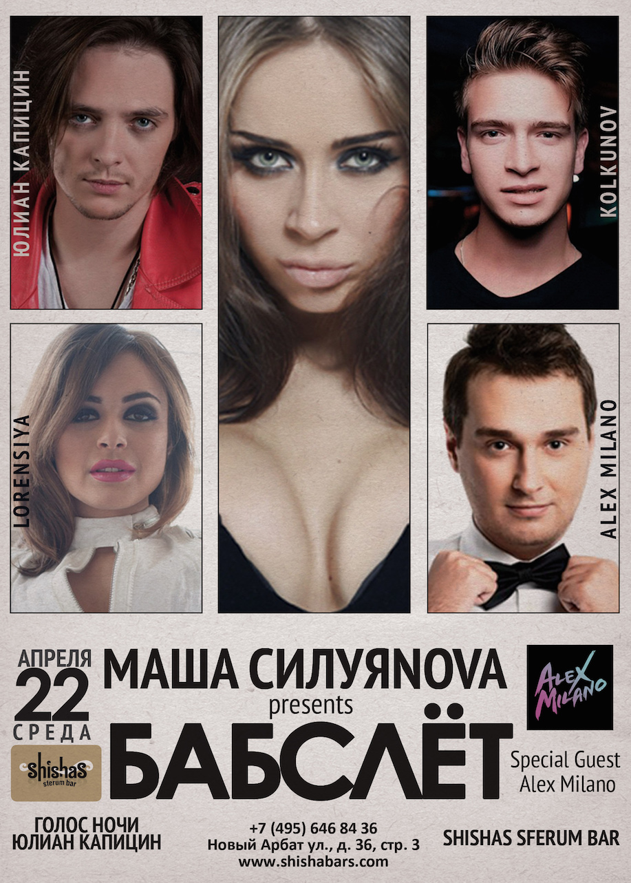 СРЕДА – 22 АПРЕЛЯ 2015 – БАБСЛЁТ by DJ МАША СИЛУЯNOVA в Shishas Sferum Bar на Новом Арбате! Отдыхаем красиво и до 6 утра! Special Guest: Alex Milano! 22 апреля – среда в Shishas Sferum Bar на Новом Арбате объявляется антигламурной! Инициатор массовых беспорядков – знаменитая королева эпатажа DJ Маша СИЛУЯNOVA! Эта дива танцпола сделает все для того, чтобы Вам сорвало башню – ведь такого массового помешательства Вы еще не видели! В чем же интрига? Бабслет – это вовсе не слет глиняных и силиконовых девчонок на халявные коктейли! Это безбашенная вечеринка, центром внимания которой станут самые известные медийные личности! Все перевернется с ног на голову и мир уже никогда не станет прежним. Скандальные группы и селебрити, супермодели, поп-звезды, рэперы, модные диджеи и телеведущие – все, кого Вы так пристально разглядывали в телеке и на Youtube, в один миг окажутся за диджейским пультом или даже за барной стойкой! А может, Вы наберетесь смелости и пригласите их к себе в компанию? В общем, запасайтесь гаджетами – делайте фотки и селфи, не забывайте маркер для автографов и всех своих друзей для отличной компании! Но помните, что гламуру здесь не место, не смотря на наличие пригламуренной и сексапильной Маши СИЛУЯNOVой! Только треш, только угар, достойный самых замусоленных страниц желтой прессы! Напрягите свое воображение! Все на Бабслет в Shishas Sferum Bar на Новом Арбате – отрываемся по сумасшедшим средам и танцуем до 6 утра! :) Special Guest: Alex Milano Голос Ночи: Юлиан Капицин (Доброе утро/MTV) DJ SET`s: МАША СИЛУЯNOVA, LORENSIYA, KOLKUNOV. Alex Milano: диджей, саунд-продюсер, имеющий итальянские корни, родился в Москве. Качество и стиль у него в крови, и он заставит каждого окунуться в атмосферу лучших модных тусовок ночной столицы. Маэстро хаус-мешап направления, которое так пользуется популярностью в России. Его сеты – это уникальное шоу с неповторимой музыкой. А его богатый профессиональный опыт и чувство танцпола никого не оставит равнодушным. Alex Milano начал свою карьеру в 2007 году, написав трек с вокалисткой клуба «Dяgilev». Хобби молодого музыканта стало перерастать в нечто большее: он становится резидентом лучшего, на то время, бара/ресторана Москвы – «Royal Bar», где собирались знаменитости и различные «сливки общества». В 2008 году – резидентом клубного проекта «Famous», который не уступал клубу «Rай», а в 2011 – «Home Sweet Home» («We Are Family») и «London». С 2012 года Алекс активно гастролирует, успев оставить за своей спиной сотни городов и десяток стран. На сегодняшний день Alex Milano является одним из самых лучших и перспективных диджеев России, входит в лучшее букинг агентство страны «MFC» и является совладельцем студии звукозаписи «BVCKYARD» (Бэк Ярд). DJ МАША СИЛУЯNOVA: САМАЯ ВОСТРЕБОВАННАЯ ДЕВУШКА-ДИДЖЕЙ В РОССИИ! Она же – ведущая, промоутер, светский персонаж. В отличие от многочисленных московских ди-джеев, она – скандальная девушка-ди-джей, не нуждается в особом представлении и дополнительных ассоциациях с каким бы то ни было ночным клубом. Интервью и видео с выступлений МАШИ СИЛУЯNOVой расходятся в интернете в геометрической прогрессии и становятся одними из самых просматриваемых в своем сегменте. Так же она является резидентом лэйбла 4DJS и EХ-резидент самого роскошного клуба Москвы SOHO ROOMS. Стартуем – каждую СРЕДУ с 23:00 и до 6 утра!