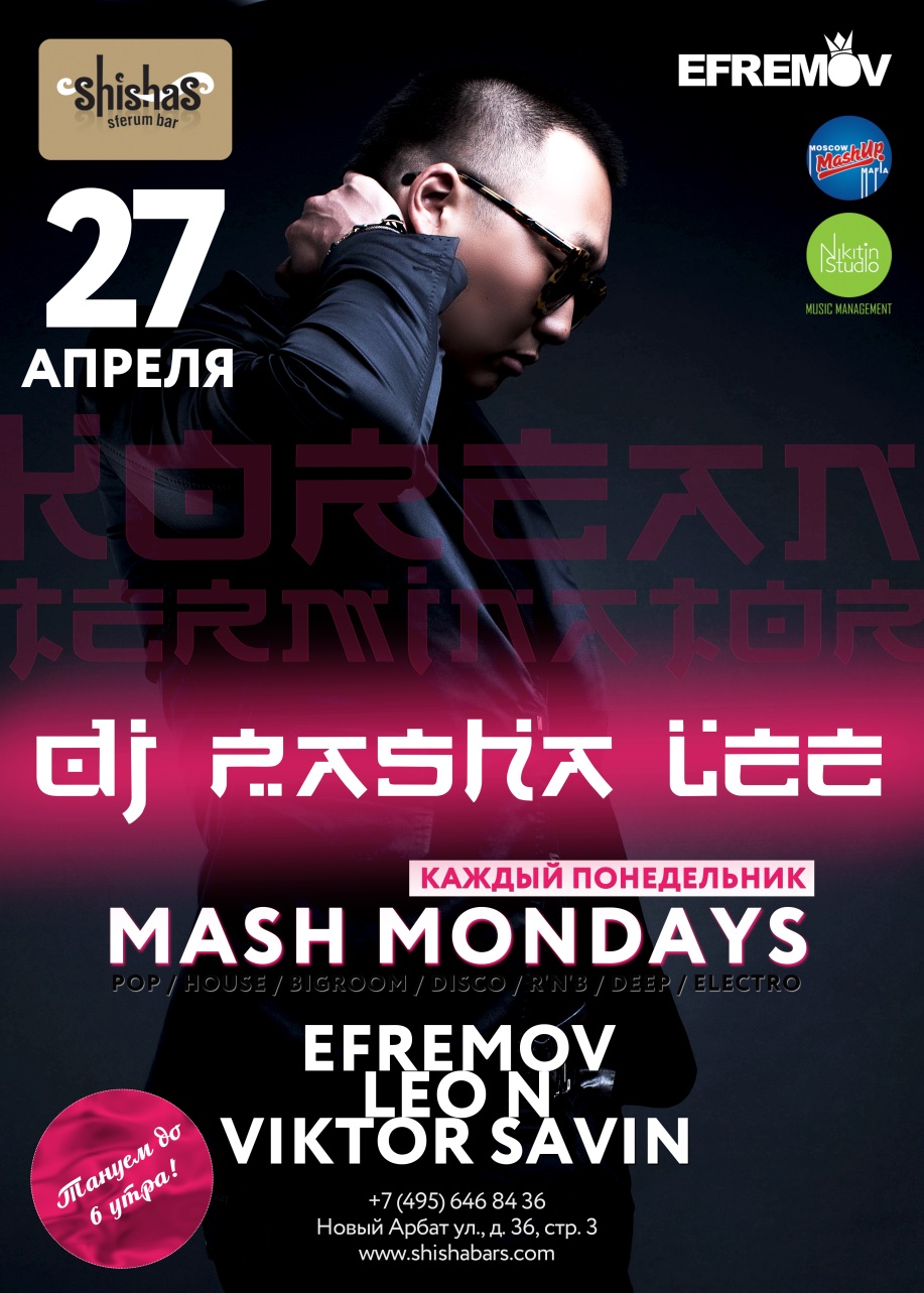 ПОНЕДЕЛЬНИК – 27 АПРЕЛЯ 2015 – Mash Mondays в Shishas Sferum Bar! Отдыхаем до 6 утра и по ПОНЕДЕЛЬНИКАМ! СТОЛЫ БЕЗ ДЕПОЗИТОВ! SPECIAL GUEST: DJ PASHA LEE! Все вокруг только и говорят, что о клубном сезоне. А мы не говорим, мы его делаем и запускаем новый проект ПО ПОНЕДЕЛЬНИКАМ – Mash Mondays в Shishas Sferum Bar! Только лучший саунд, самые отборные треки, горячие GO-GO, заводные MC, крутые МЭШАП диджеи и, конечно, наши фирменные СУПЕР-ПУПЕР АКЦИИ на бар, кухню и кальяны!!! ПО ПОНЕДЕЛЬНИКАМ с 23:00 и до 6 утра отдыхаем и танцуем под ритмы: POP, HOUSE, BIGROOM, DISCO, RnB, DEEP и ELECTRO! Mash Mondays – это серия ярких ПОНЕДЕЛЬНИКОВ для тех, кто не успел отдохнуть в выходные или начинает неделю с тусы! Mash Mondays – это отличная возможность попасть на сеты известных МЭШАП диджеев в будний день! Mash Mondays – это ночной град танцевальных стилей и диджей сеты топовых музыкантов и артистов! Mash Mondays – это веселые компании, вкусные кальяны и сумасшедшие акции на баре! Shishas Bar – never sleeps!!! ;) Итак, теперь и в ПОНЕДЕЛЬНИК в Shishas Sferum Bar на Новом Арбате, Вам обеспечена отличная вечерина – Mash Mondays в Shishas Sferum Bar! HAPPY HOURS каждый ПОНЕДЕЛЬНИК: