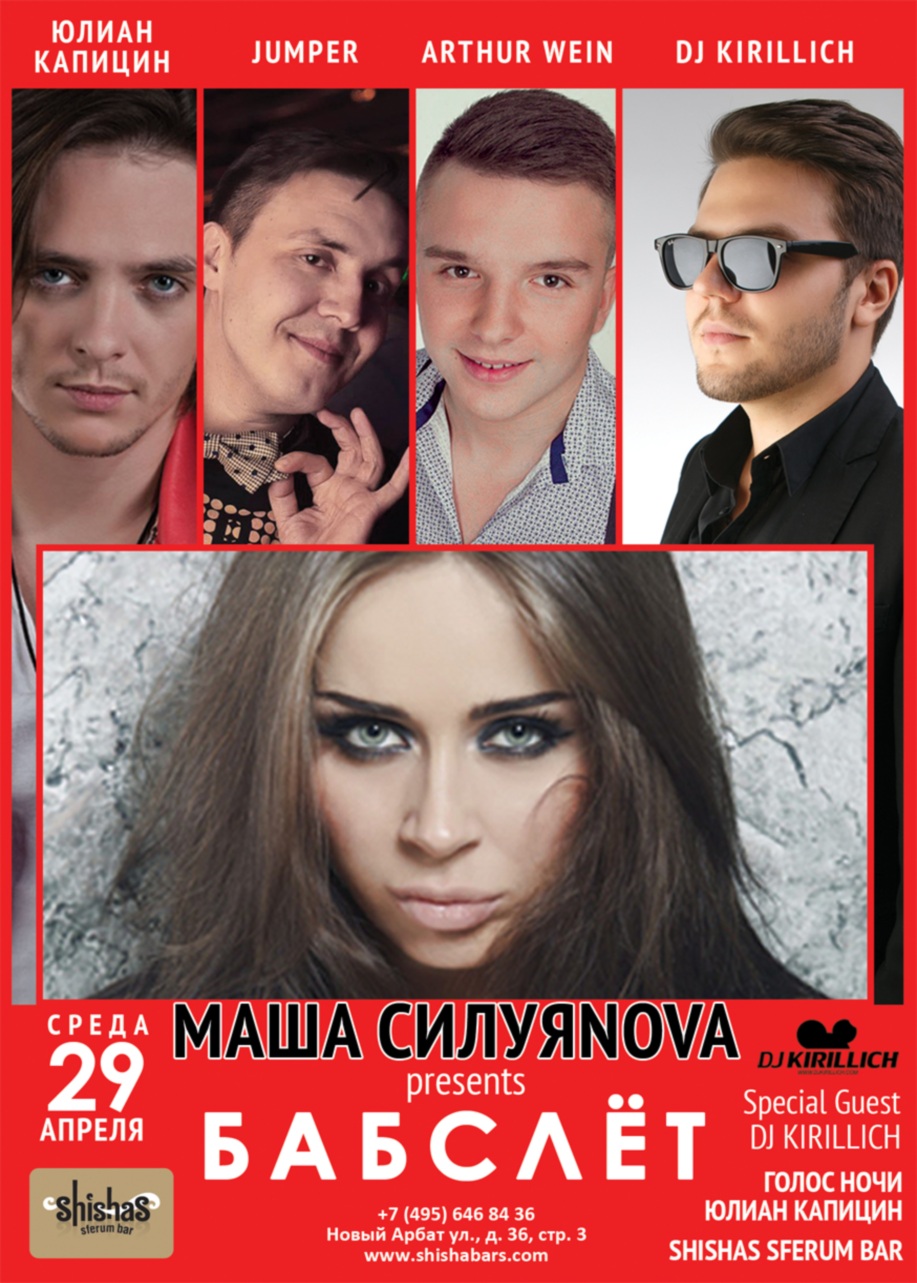 СРЕДА – 29 АПРЕЛЯ 2015 – БАБСЛЁТ by DJ МАША СИЛУЯNOVA в Shishas Sferum Bar на Новом Арбате! Отдыхаем красиво и до 6 утра! Special Guest: DJ KIRILLICH! 29 апреля – среда в Shishas Sferum Bar на Новом Арбате объявляется антигламурной! Инициатор массовых беспорядков – знаменитая королева эпатажа DJ Маша СИЛУЯNOVA! Эта дива танцпола сделает все для того, чтобы Вам сорвало башню – ведь такого массового помешательства Вы еще не видели! В чем же интрига? Бабслет – это вовсе не слет глиняных и силиконовых девчонок на халявные коктейли! Это безбашенная вечеринка, центром внимания которой станут самые известные медийные личности! Все перевернется с ног на голову и мир уже никогда не станет прежним. Скандальные группы и селебрити, супермодели, поп-звезды, рэперы, модные диджеи и телеведущие – все, кого Вы так пристально разглядывали в телеке и на Youtube, в один миг окажутся за диджейским пультом или даже за барной стойкой! А может, Вы наберетесь смелости и пригласите их к себе в компанию? В общем, запасайтесь гаджетами – делайте фотки и селфи, не забывайте маркер для автографов и всех своих друзей для отличной компании! Но помните, что гламуру здесь не место, не смотря на наличие пригламуренной и сексапильной Маши СИЛУЯNOVой! Только треш, только угар, достойный самых замусоленных страниц желтой прессы! Напрягите свое воображение! Все на Бабслет в Shishas Sferum Bar на Новом Арбате – отрываемся по сумасшедшим средам и танцуем до 6 утра! :) Special Guest: DJ KIRILLICH Голос Ночи: Юлиан Капицин (Доброе утро/MTV) DJ SET`s: МАША СИЛУЯNOVA, Arthur Wein, Jumper DJ KIRILLICH: один из самых востребованных и успешных диджеев страны, ремиксер, саунд продюсер. Невероятно обладает техникой Scratch, Speedmix и многими другими «фишками», которые делают его выступление эксклюзивным и запоминающимся! Каждое выступление KIRILLICH превращает в полноценное шоу, не смотря на то, что он в первую очередь диджей, можно смело говорить о том, что это профессиональный артист. Его треки играют несметное количество диджеев по всей планете, а также их можно услышать на топовых радиостанциях и различных чартах. Входит в 100 лучших DJ’s России. DJ KIRILLICH является резидентом популярного музыкального клубного бренда THE REAL BUSTERS. Также он является резидентом различных знаменитых московских заведений, в том числе и сети ShishasBar. DJ МАША СИЛУЯNOVA: САМАЯ ВОСТРЕБОВАННАЯ ДЕВУШКА-ДИДЖЕЙ В РОССИИ! Она же – ведущая, промоутер, светский персонаж. В отличие от многочисленных московских ди-джеев, она – скандальная девушка-ди-джей, не нуждается в особом представлении и дополнительных ассоциациях с каким бы то ни было ночным клубом. Интервью и видео с выступлений МАШИ СИЛУЯNOVой расходятся в интернете в геометрической прогрессии и становятся одними из самых просматриваемых в своем сегменте. Также она является резидентом лэйбла 4DJS и EХ-резидент самого роскошного клуба Москвы SOHO ROOMS. Стартуем – каждую СРЕДУ с 23:00 и до 6 утра! Non-stop DJ set от резидентов: 18:00-06:00 Sexy Go-Go Ladies: 00:00-04:00 *********************************************************************** При заказе стола от 8-ми человек – бутылка итальянского игристого В ПОДАРОК! День Рождения? Дарим скидку 20% на ВЕСЬ счет! :) Отметь День Рождение в Shishas Sferum Bar: получи скидку 20% на весь счет! Happy Hours каждую СРЕДУ:
