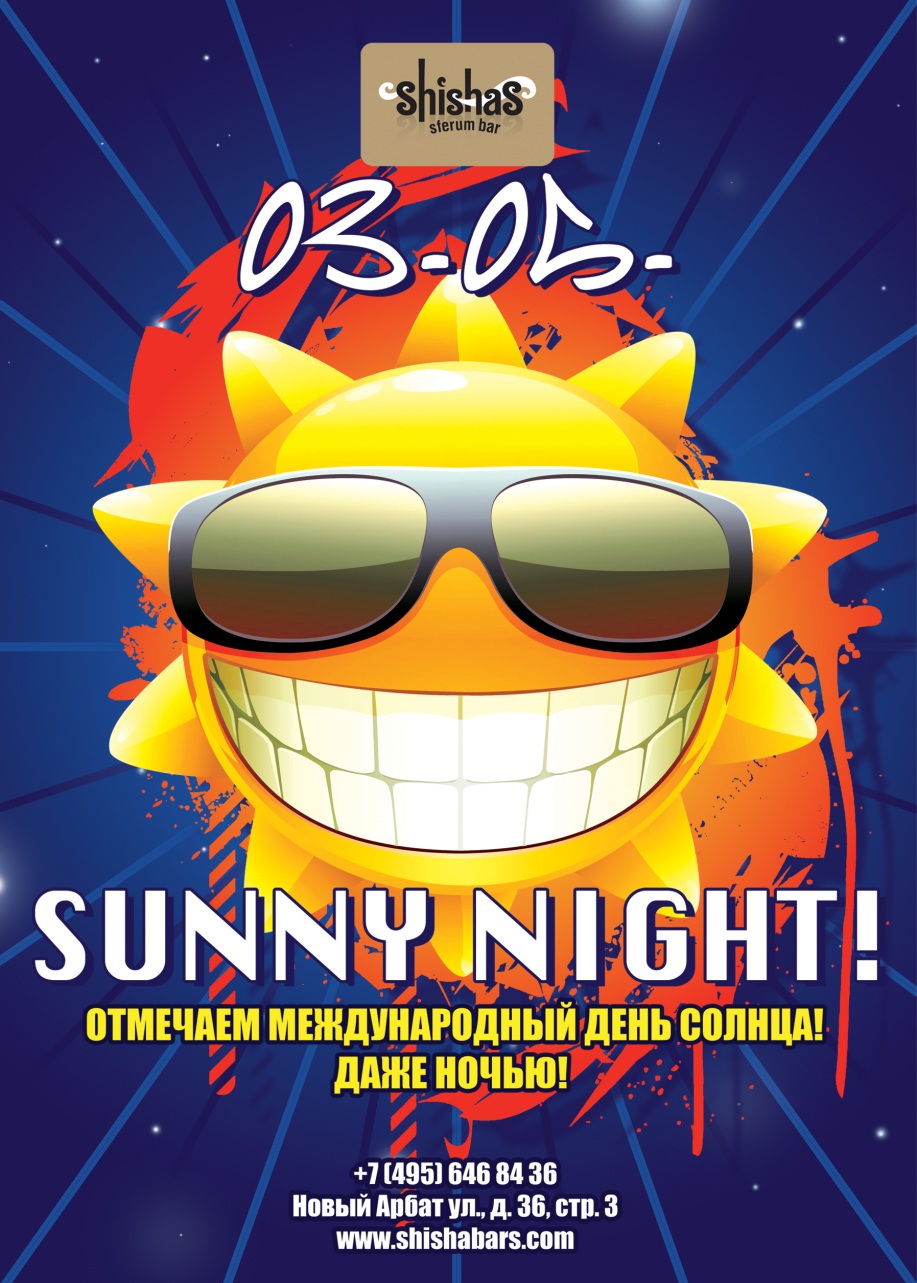 ВОСКРЕСЕНЬЕ – 3 МАЯ 2015 – SUNNY NIGHT в Shishas Sferum Bar на Новом Арбате! ОТМЕЧАЕМ МЕЖДУНАРОДНЫЙ ДЕНЬ СОЛНЦА! ДАЖЕ НОЧЬЮ! Готовы поспорить, что такой праздник Вы никогда не отмечали! Давайте, как можно скорее это исправим? Только в Shishas Sferum Bar на Новом Арбате у Вас есть возможность отметить праздник нашего солнышка, по которому мы так сильно соскучились! Реалии нашего города таковы, что под настоящим солнцем можно погреться от силы 3-и месяца, да и то не каждый день. В Shishas Sferum Bar на Новом Арбате Вы получите не меньшее количество позитива и витамина D, чем от принятия летних солнечных процедур! Живительный эффект от наших вечеринок уже ощутили десятки и даже сотни наших Гостей – оглянитесь, видите сколько карамельно-загорелых девушек вокруг Вас? То-то же! Солярий, конечно, не обещаем, но довольную улыбку, ударную дозу эндорфинов, солнечное настроение и впечатляющий рассвет в 5 утра – это запросто! Засветись и ты на нашей искристо-солнечной вечеринке, зажигающей бодрящим огнем радости! Пусть всегда будет солнце, пусть всегда будет небо, пусть всегда будет Shishas Sferum Bar на Новом Арбате!