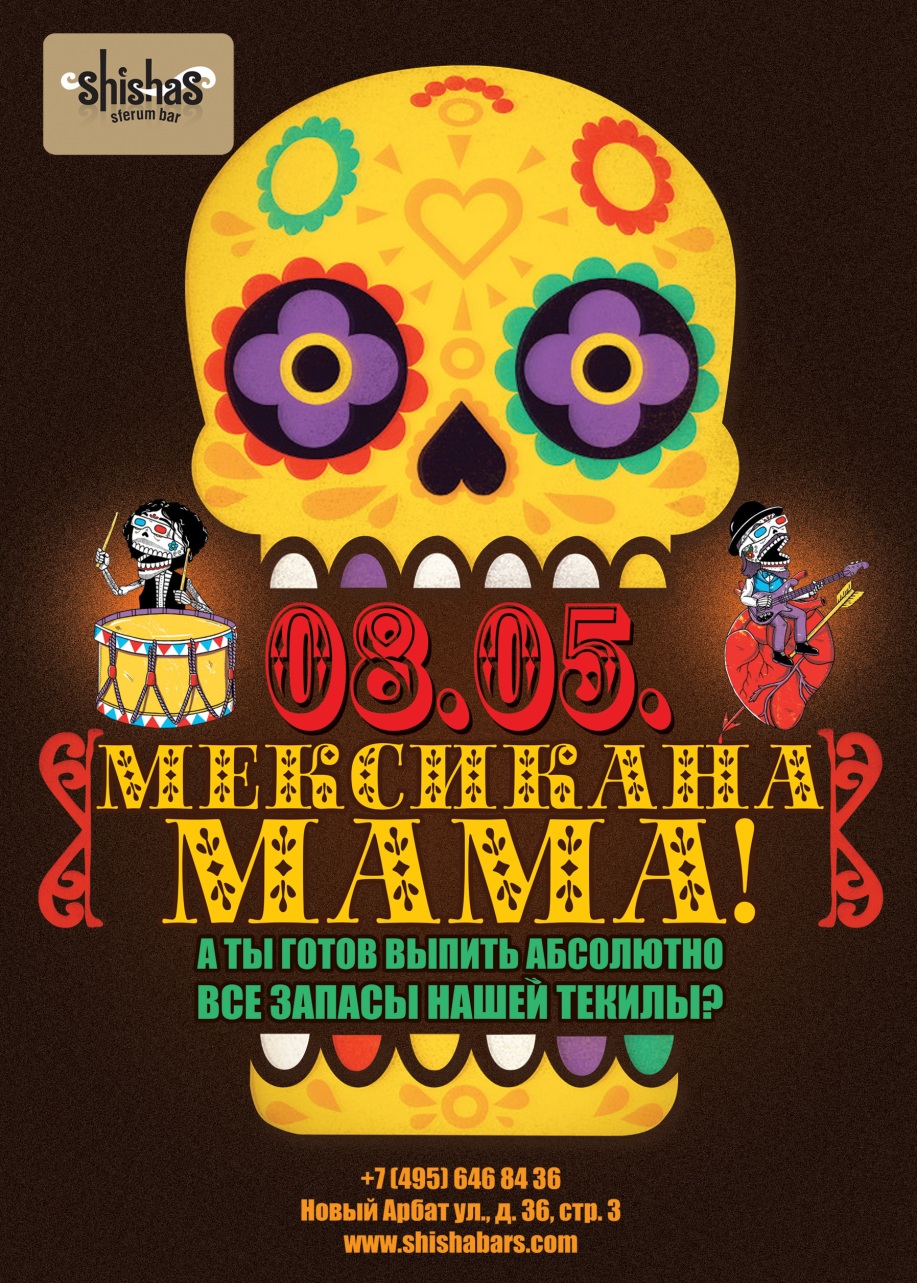 ПЯТНИЦА – 8 МАЯ 2015 – МЕКСИКАНА МАМА в Shishas Sferum Bar на Новом Арбате! А ты готов выпить абсолютно все запасы нашей текилы? Мексика – темпераментная страна с нешуточными страстями. Мексиканки стройны, гордятся своей безупречной кожей и аппетитными формами, а мексиканские парни с трудом сдерживают бурлящую кровь и готовы продемонстрировать крепкую мужскую силу. Мексике есть чем гордиться: в этой жаркой стране всегда есть кристально чистая текила, роскошные вина, бренди и разжигающие страсть танцы! Особо чувствительные могут вспомнить мексиканские сериалы! :) А мы с Вами, Друзья, сегодня в Shishas Sferum Bar на Новом Арбате устроим отвязную мексиканскую вечеринку! Мы уже приготовили превосходные шоты с текилой для правильного настроения! Выбирай кристально чистую текилу под предводительством наших опытных барменов, а великолепные танцовщицы доведут тебя до точки кипения! Мексиканские страсти – дело нешуточное и будут очень в тему горячим весенним вечером! Ждем самых отвязных Педро, Хуанов и Кончит в Shishas Sferum Bar на Новом Арбате! Дружно погружаемся в настоящую мексиканскую ночь: пончо и сомбреро, усы для самых пьяных, алко-конкурсы и соответствующие призы!